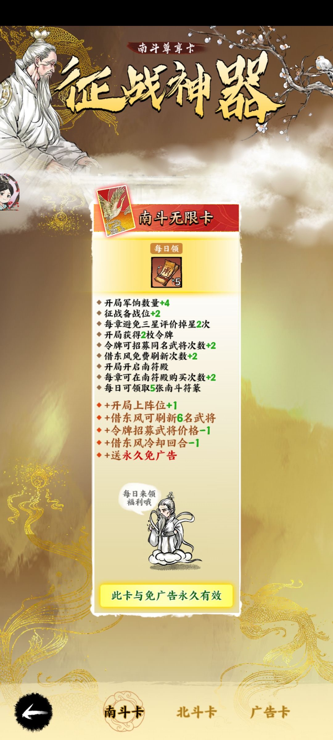 开局加粮草,开启借东风(有利于我们更好的刷橙将三星)冷却时间是4回合.在关卡里还可以购买同名武将次数增加,是不错的.(氪于不氪看个人,官方有一个南斗六天日常任务坐满六天拿到六把钥匙送一天哦