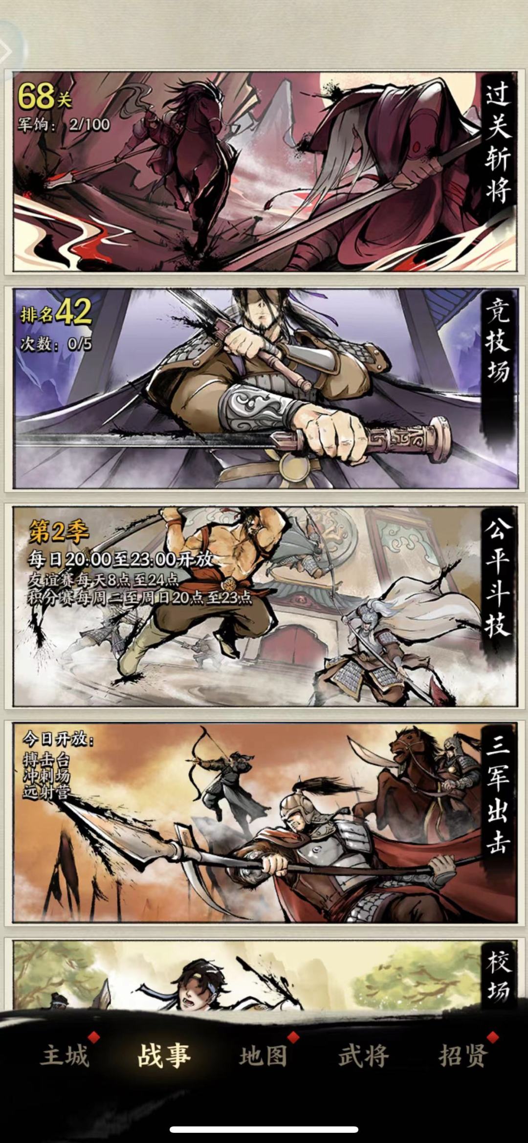 、战事包括七个:过关斩将、竞技场、公平竞技、三军出击、校场练兵、排位赛、领地争夺