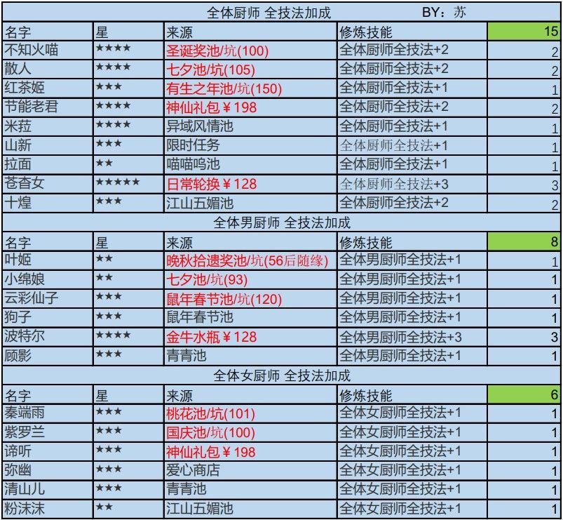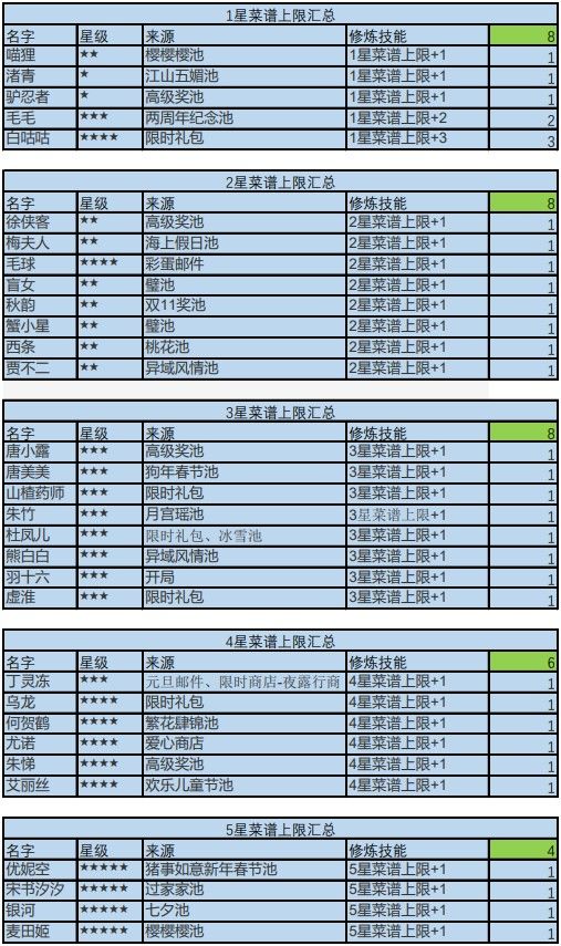 搞了个表格,里面有全技法加成,全售价加成,全菜谱上限加成,六维加成,还有新出的素材获取加成,并且sheet1里面做了个人修炼与满修炼差值计算,但为了避免误触导致数据错误,把后面的sheet全都锁了,只可以在“个人修炼”sheet里面的“个人”列填数值,Excel表格发到查询群了,这里更新几张图方便不进群的玩家查看