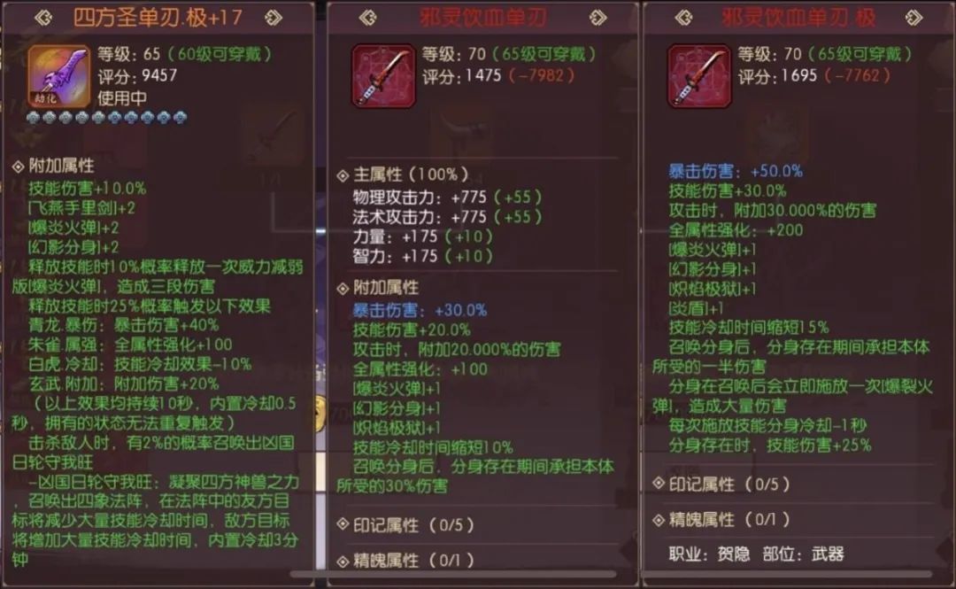目前版本贺隐推荐黑夜+十握,虽然后续输出乏力,但10秒内的爆发性还是相当不错。后期防具极以后,观望宿命+十握,对贺隐而言70级武器拿掉刷新小蛤蟆,新增释放技能减分身CD,是削弱还是加强有待考证。