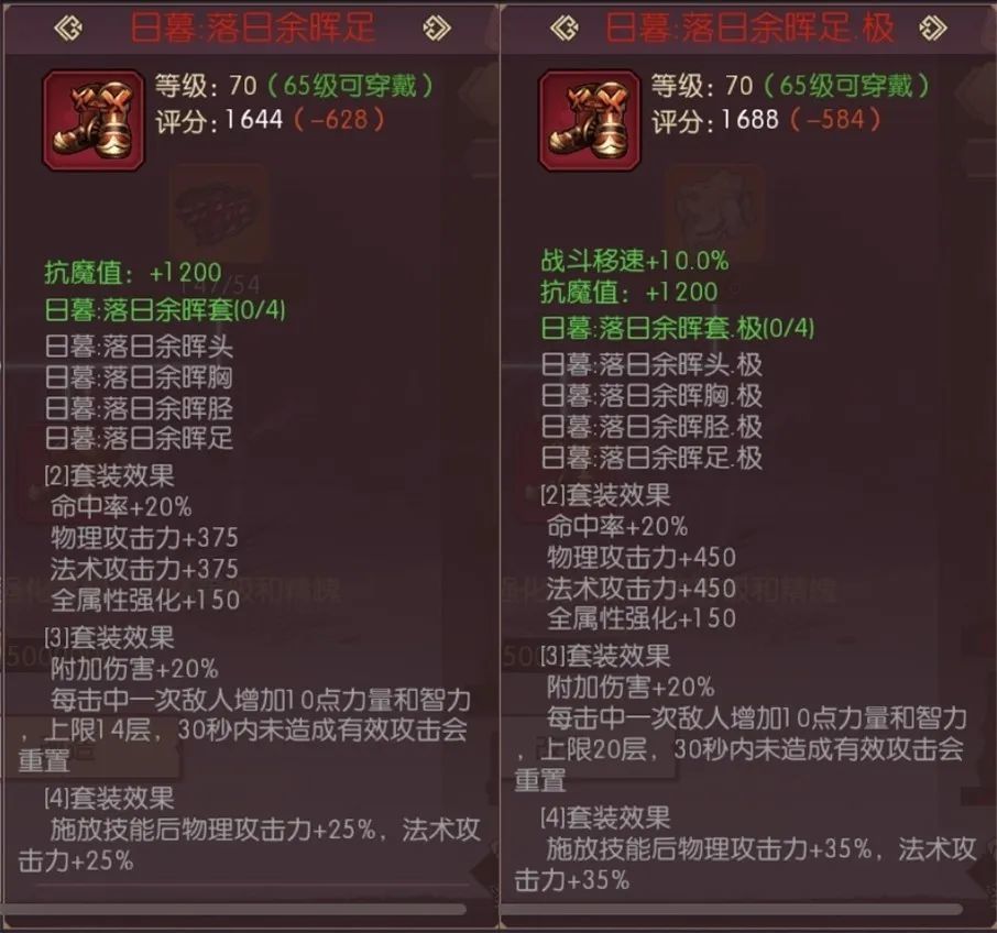 黄昏是诞生即巅峰的套装,其装备特性主要为面板攻击的加成,在装备成长性上不如其他三套,同样对于暴击爆伤的打造有较高的要求,故此不推荐贺隐玩家做黄昏套,除了好看似乎没有太大的实战价值。