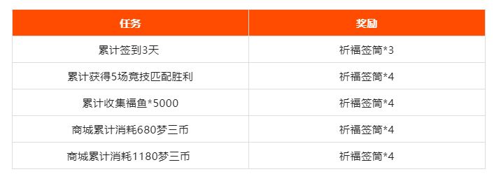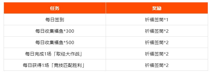 获得祈福签筒,摇签卜卦,兑换封灵玉、限定礼包和月之匙等道具。兑换时间:1月22日00:00-2月1日23:59①消耗卦签·上吉*3+卦签·大吉*2+卦签·吉*2,可兑换征战四方·封灵玉自选*1,兑换上限为6。