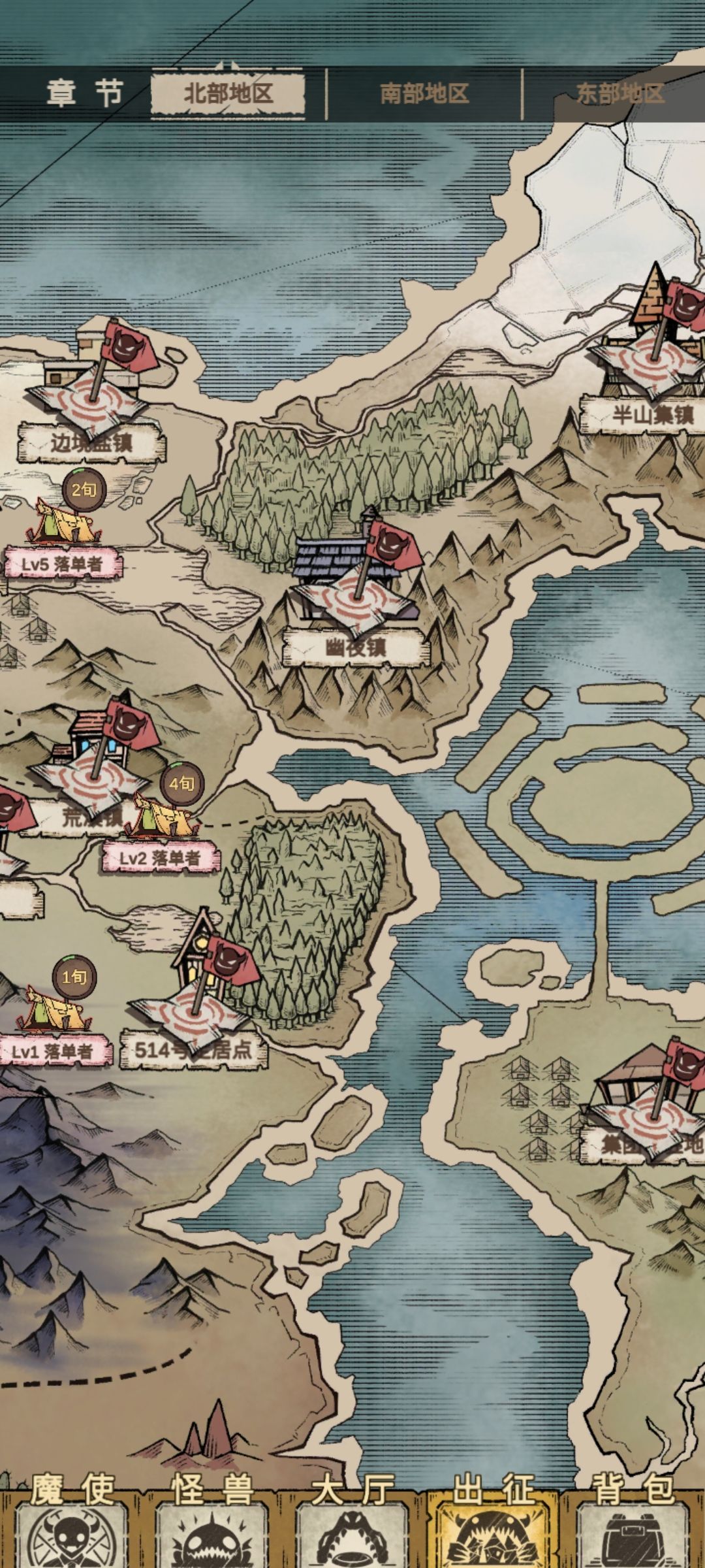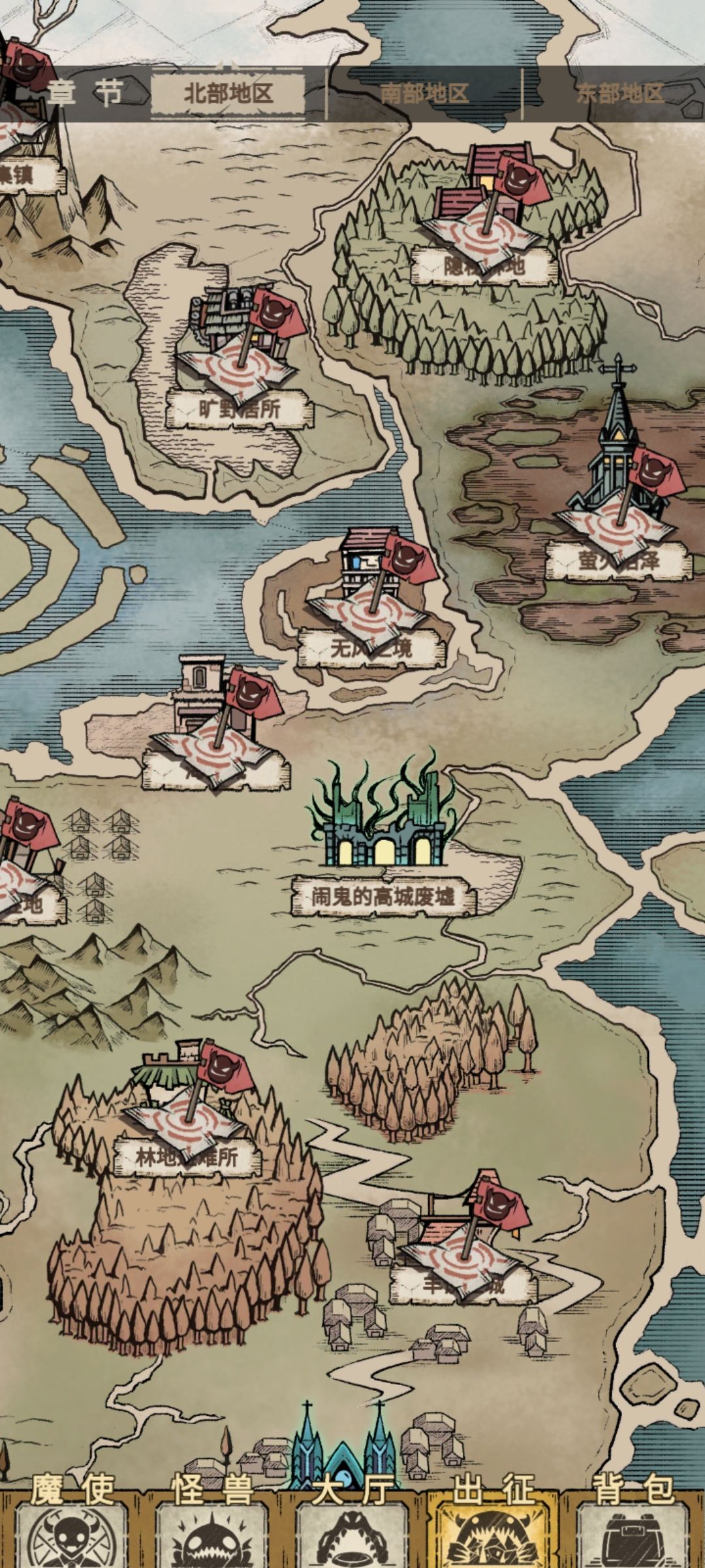 在后续更新章节中是否有重启北部地图的打算,比如:新章节-北地争夺。北部地图其实很有意思,乌镇,幽夜镇,萤火沼泽,林地避难所。这4个重镇很像4个节点城镇,它们周围又有3个小镇可以分别划分管辖3个村镇。如果新增一下互动,玩家可以点击这4个城市派遣一只怪兽驻守,驻守一段时间有一定的收益。落单者在3个村镇旁刷新,初始1-5级,玩家不攻打不会消失,落单者计时结束后自动升随机等级甚至高等级有勇者加入,勇者加入后每旬高几率自动占领村镇,当魔主毫无作为,重镇周围3村镇全被占领后开启重镇包围,重镇中怪兽无法撤离,无法治疗。如果还不紧急解围将开启勇者攻城,没错,我想的就是那个,勇者也来围殴怪兽了,不带小兵,随机1-3名勇者与怪兽作战,怪物死亡城镇失守。怪物胜利,根据上场的勇者数量重新毁灭1-3个村镇。