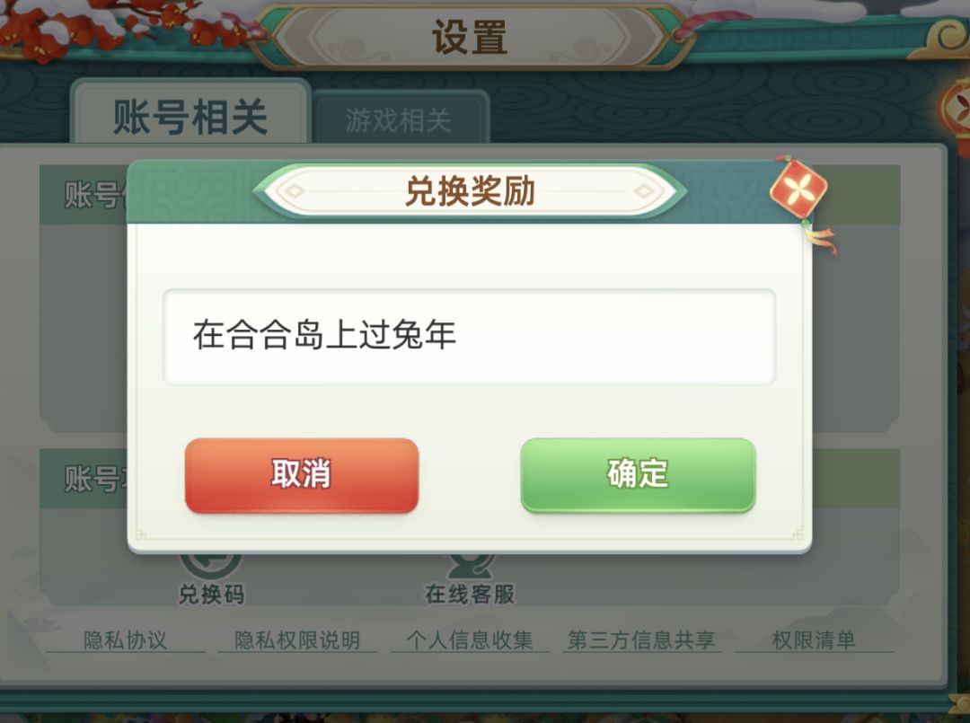 (Tips:兑换码截止到2月1日,请各位岛主们尽快使用;兑换码使用方法:当岛主等级达到7级后,岛主大大们可以通过右上角的设置系统-账号功能-兑换码按钮)