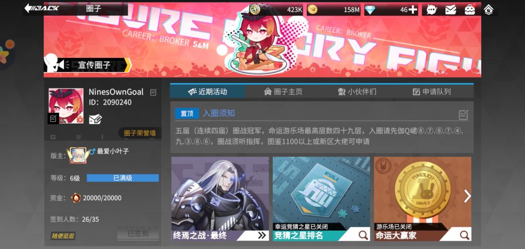 当然,拜年怎能没有红包呢?大年初一至初六(1月22日至1月27日),NinesOwnGoal将于每日中午11:30——12:00限时开放圈子30分钟让大家领取目前命运游乐场最高层数奖励,最高可得12000钻(进圈后在“任务—主线任务—命运挑战者”领取,当前所在圈子在命运游乐场通关层数越低,进入NinesOwnGoal后所能领取的钻石越高)圈号见配图