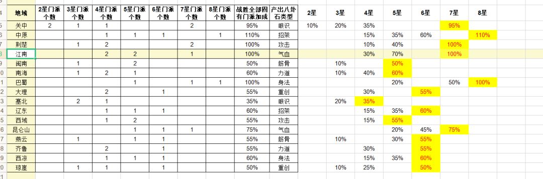 黄底红字的为打过当前地区最强门派成为第一大派的巡逻加成。所以刚开始开派都在关中,后面有些人会把门派迁移至塞北、闽南、南海等地,就是为了拿第一大派的巡逻加成50%。迁移门派第一次免费 之后需要五湖四海令。