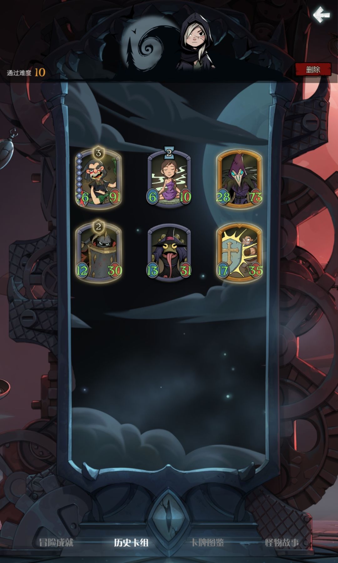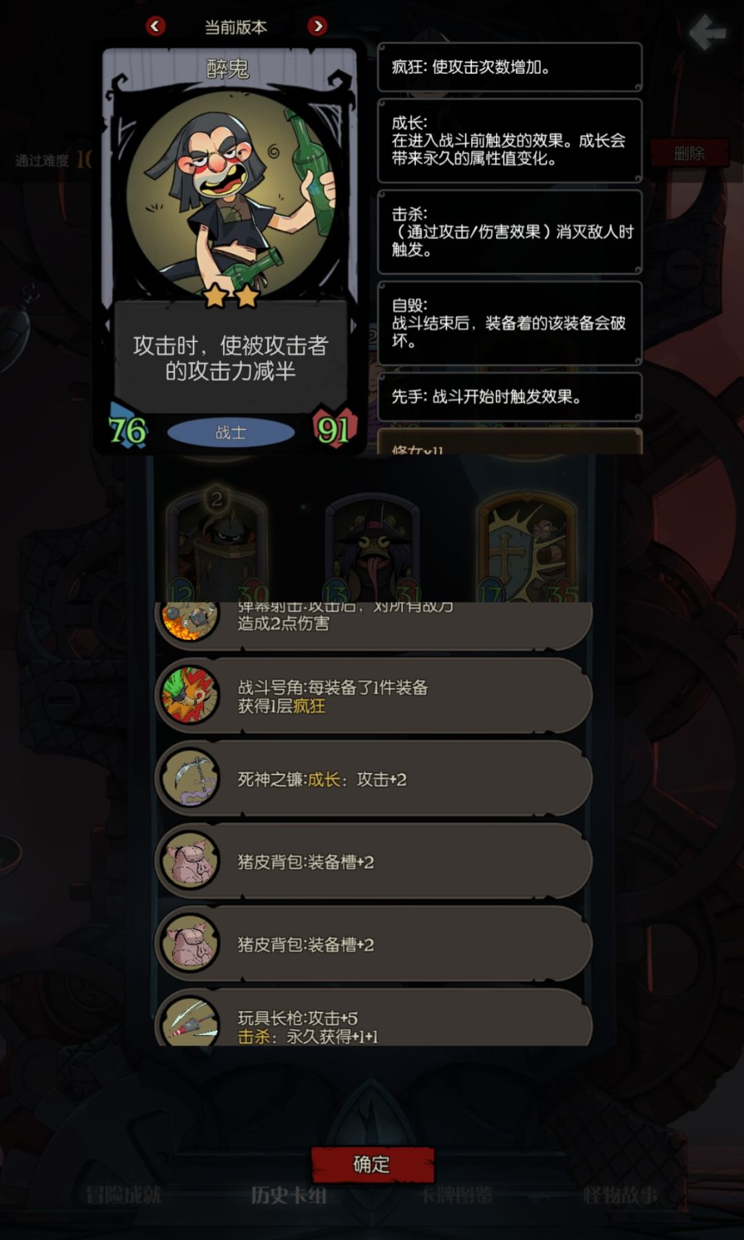 如下图,除醉鬼和装备外没有任何刻意寻找的卡牌,中期用上述推荐的卡牌撑场即可。