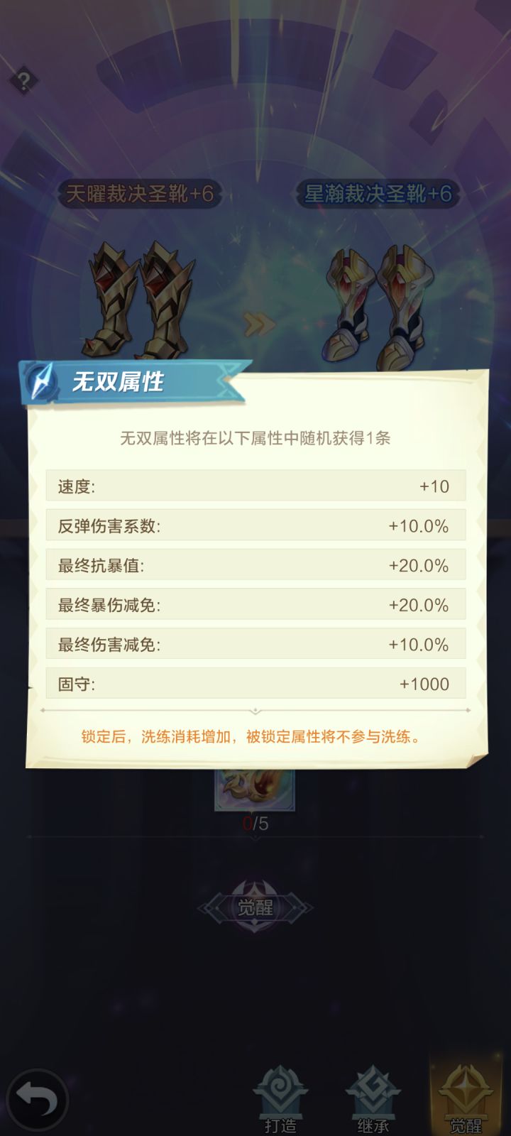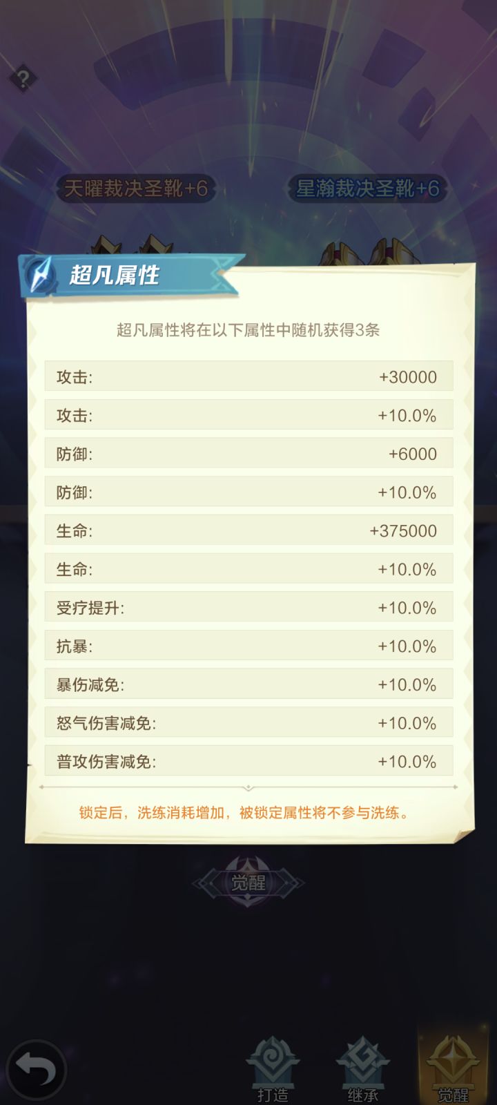 集齐一套天耀装备之后,就可以消耗五个[金焰神凤]觉醒为更高级星瀚装备,获得基础、超凡、无双属性。