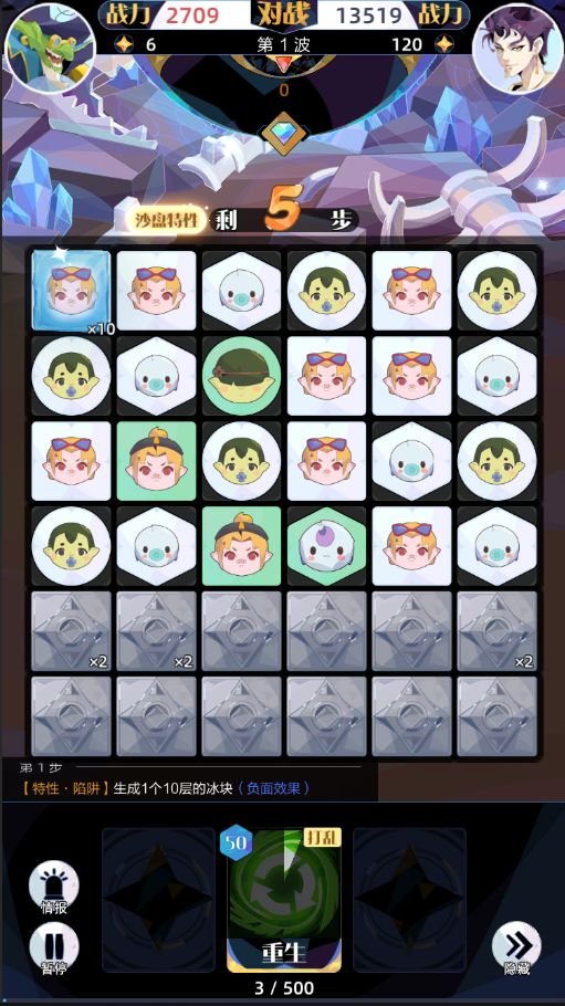 每当拖出精英形态(及以上)的伙伴格后,随机增加3个10层冰块(负面效果的格子超过沙盘格总数的3/4时则不再生成)