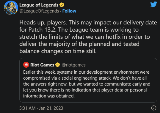 在拳头发表完这篇声明后,《英雄联盟》官方也表示13.2补丁的发布日期可能会比预期晚。官方表示“联盟团队正在努力修复问题,以便按时交付大部分计划和测试的平衡更改。”