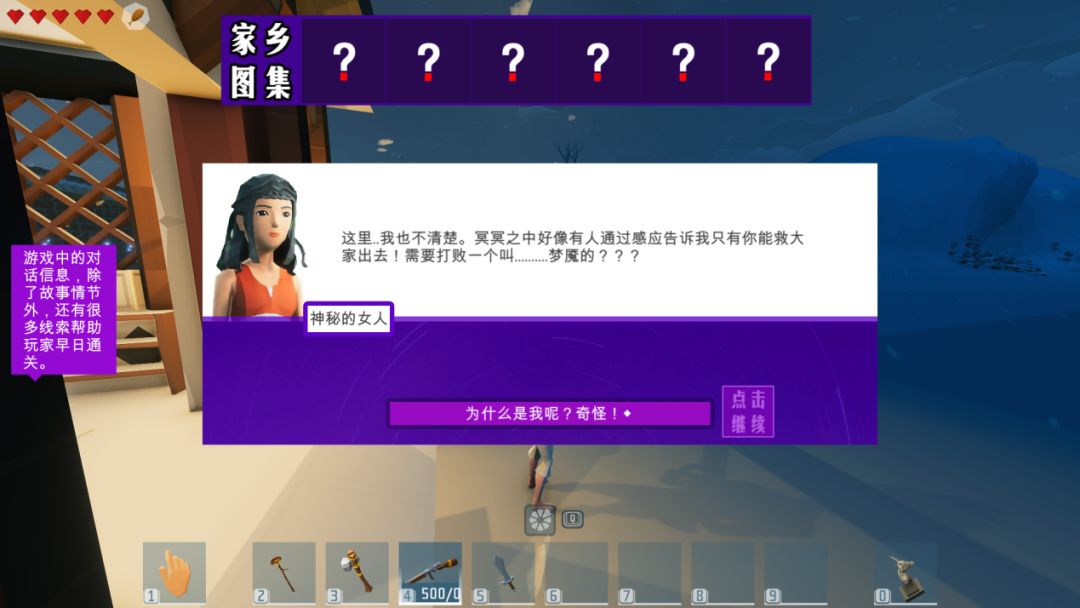 在与神秘女人的对话中得知我们被卷入了一场巨大的危险中,并且需要打败梦魇才能够解救所有人。然而当我们出发时我们的主角小明却表示这个女人非常可疑,于是我们打算先救出人后再做打算。