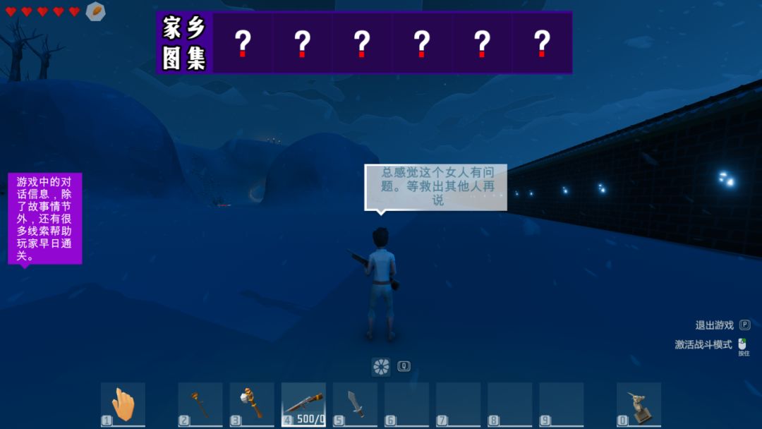 搜索完屋里装备后,我们可以获得斧头、木铲、钢机枪、铁剑、不落面具以及一个雕像,然后我们就可以出门与门口的神秘女人对话了。