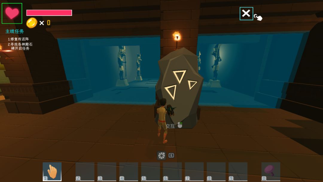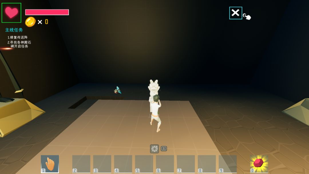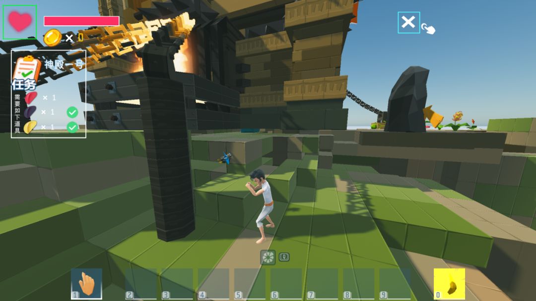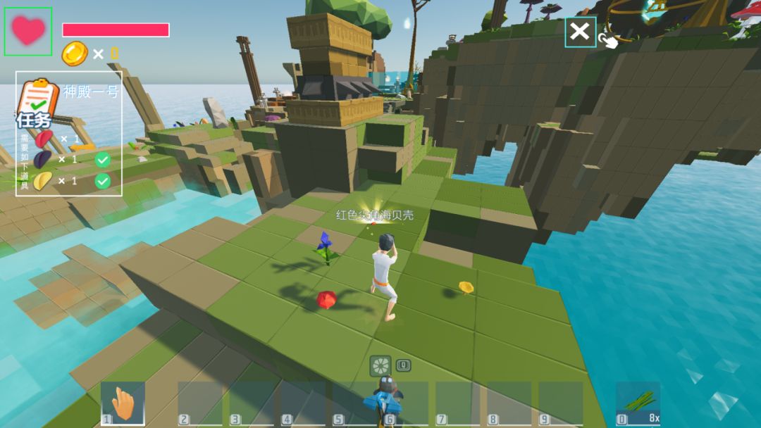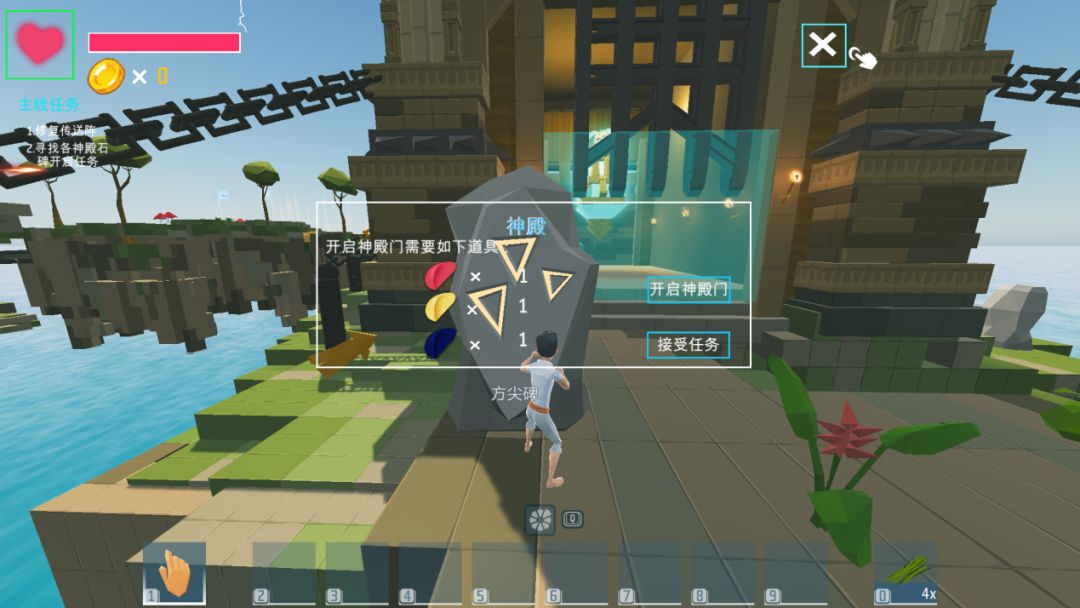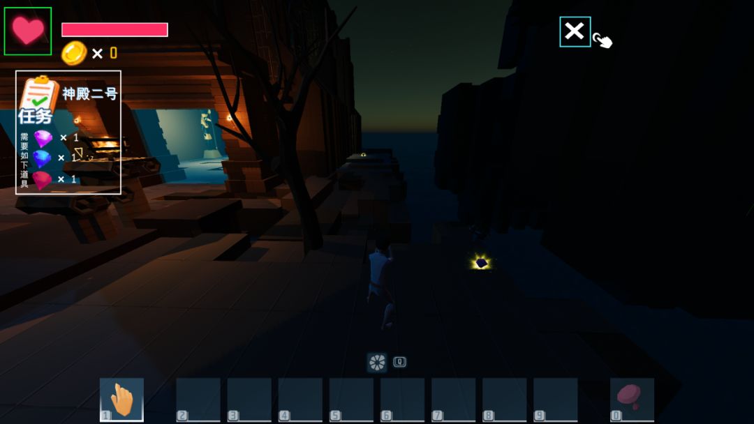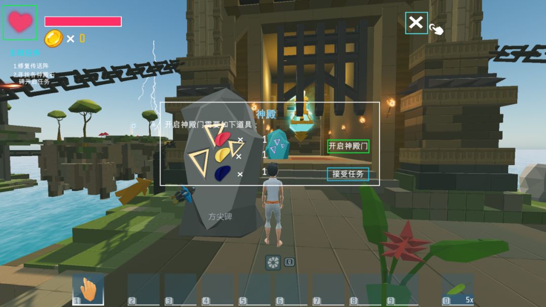 接受任务后向神殿左边移动,会发现地上有一颗发光的石头,靠近后捡去获得“任务道具”,这里一共有黑色和黄色的贝壳,拾取完后回到神殿门口并且向左边的桥上走去,同样会发现发光的石头,拾取后神殿一号的解锁道具就搜集完成啦。