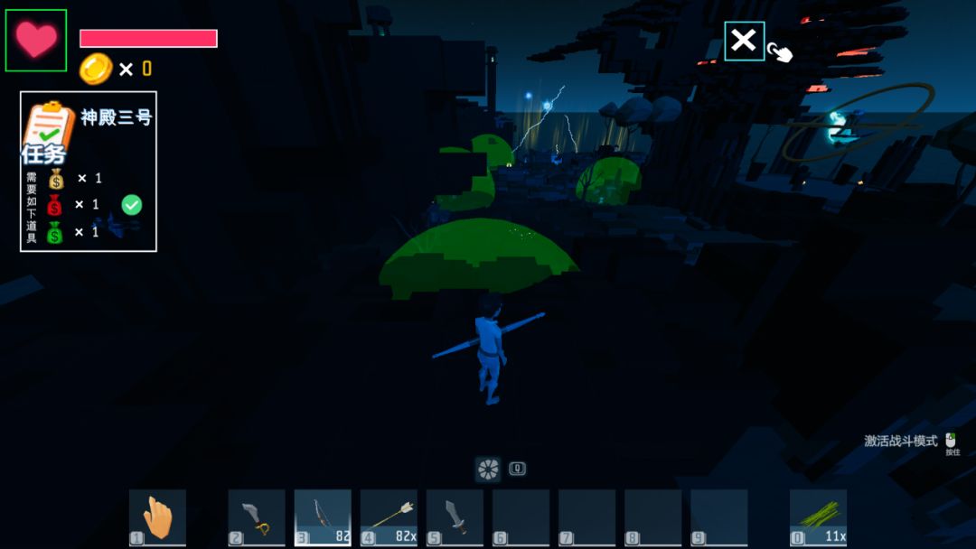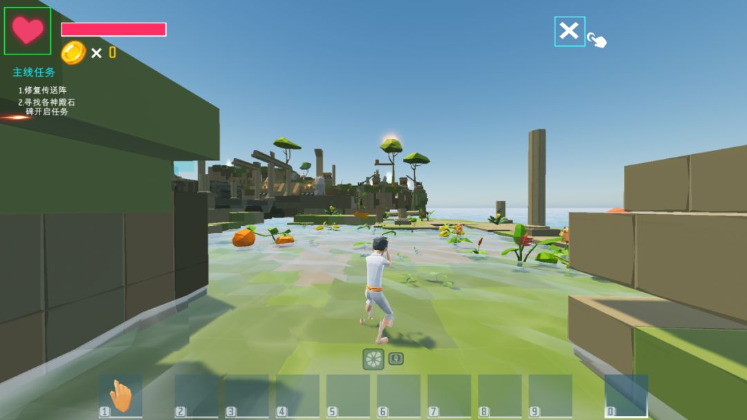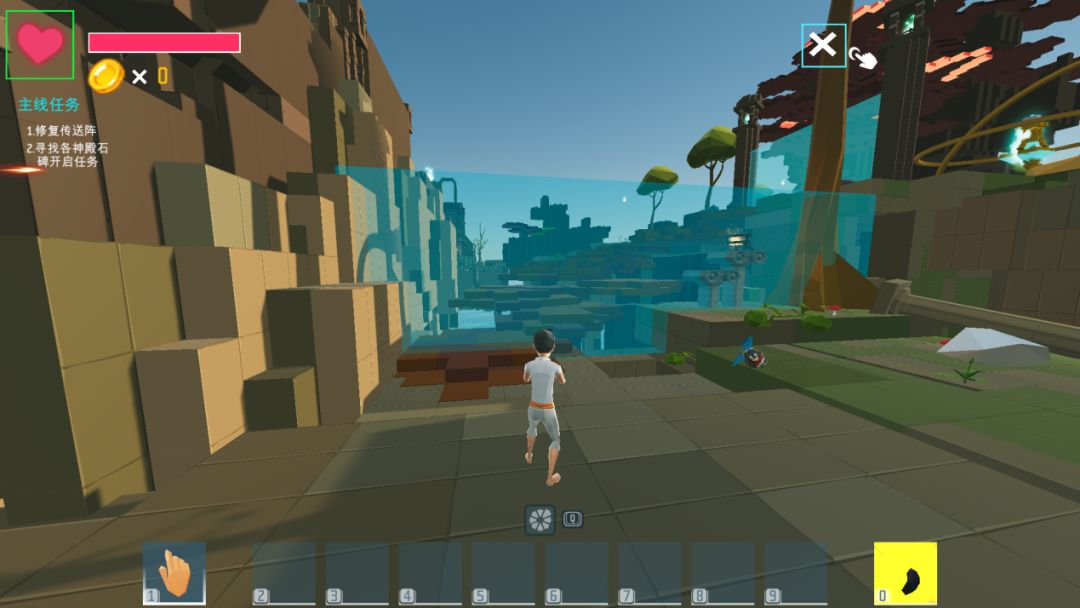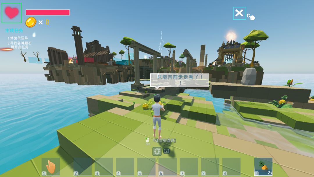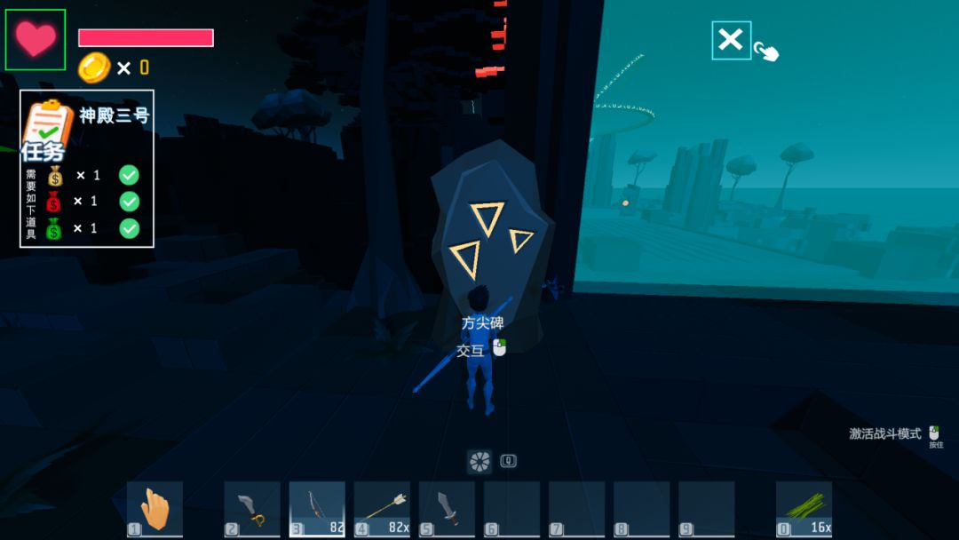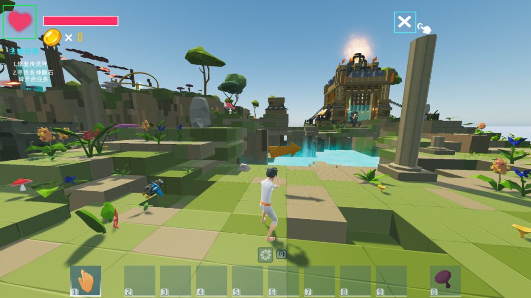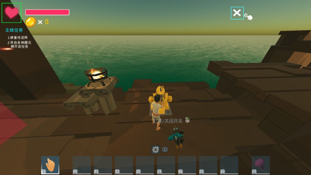 接受任务后向神殿左边移动,会发现地上有一颗发光的石头,靠近后捡去获得“任务道具”,这里一共有黑色和黄色的贝壳,拾取完后回到神殿门口并且向左边的桥上走去,同样会发现发光的石头,拾取后神殿一号的解锁道具就搜集完成啦。