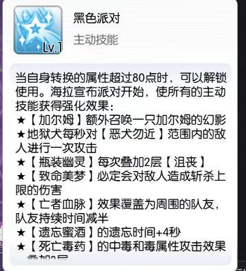 2)有[黑色派对]情况下,海拉的[致命美梦]只有固定伤害,不判定后续斩杀,如:单位A有11%血,海拉在[黑色派对]下用了[致命美梦](10%斩杀线),A单位变为1%血,然后A不会死亡。单位A有9%血,海拉在[黑色派对]下用了[致命美梦](10%斩杀线),A单位无论有什么保命技能,直接死亡。