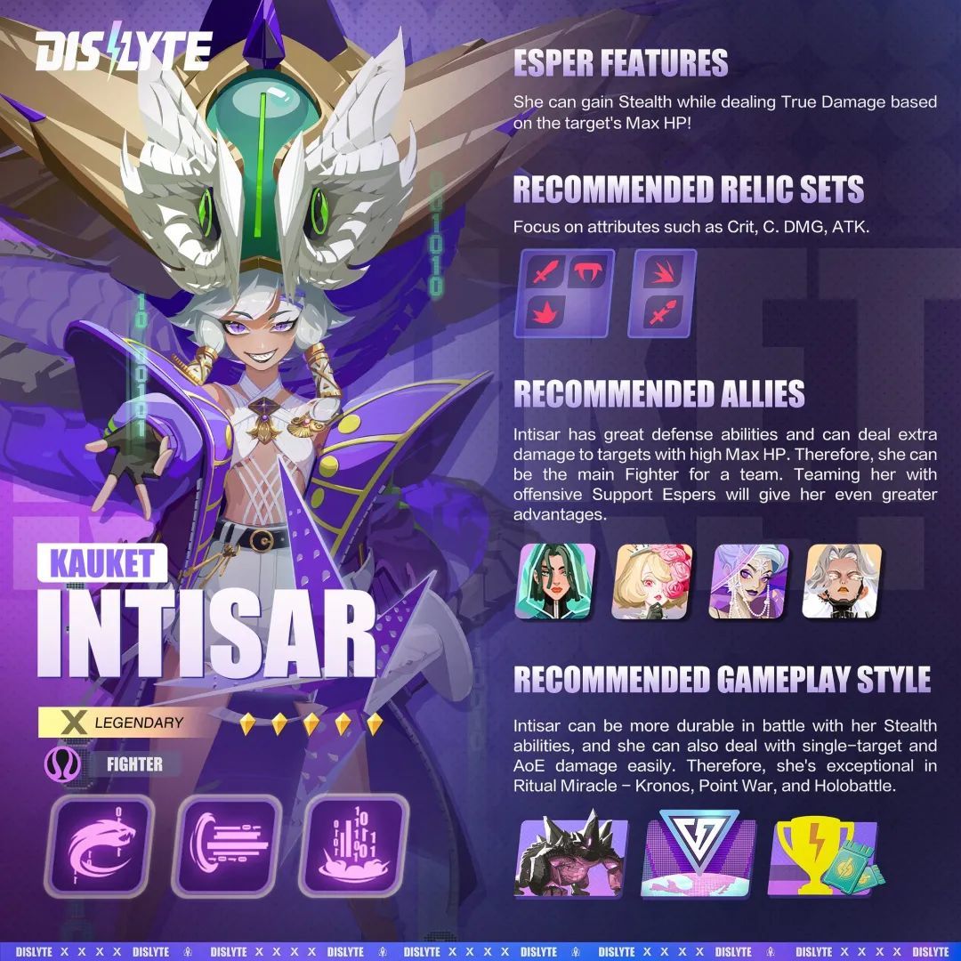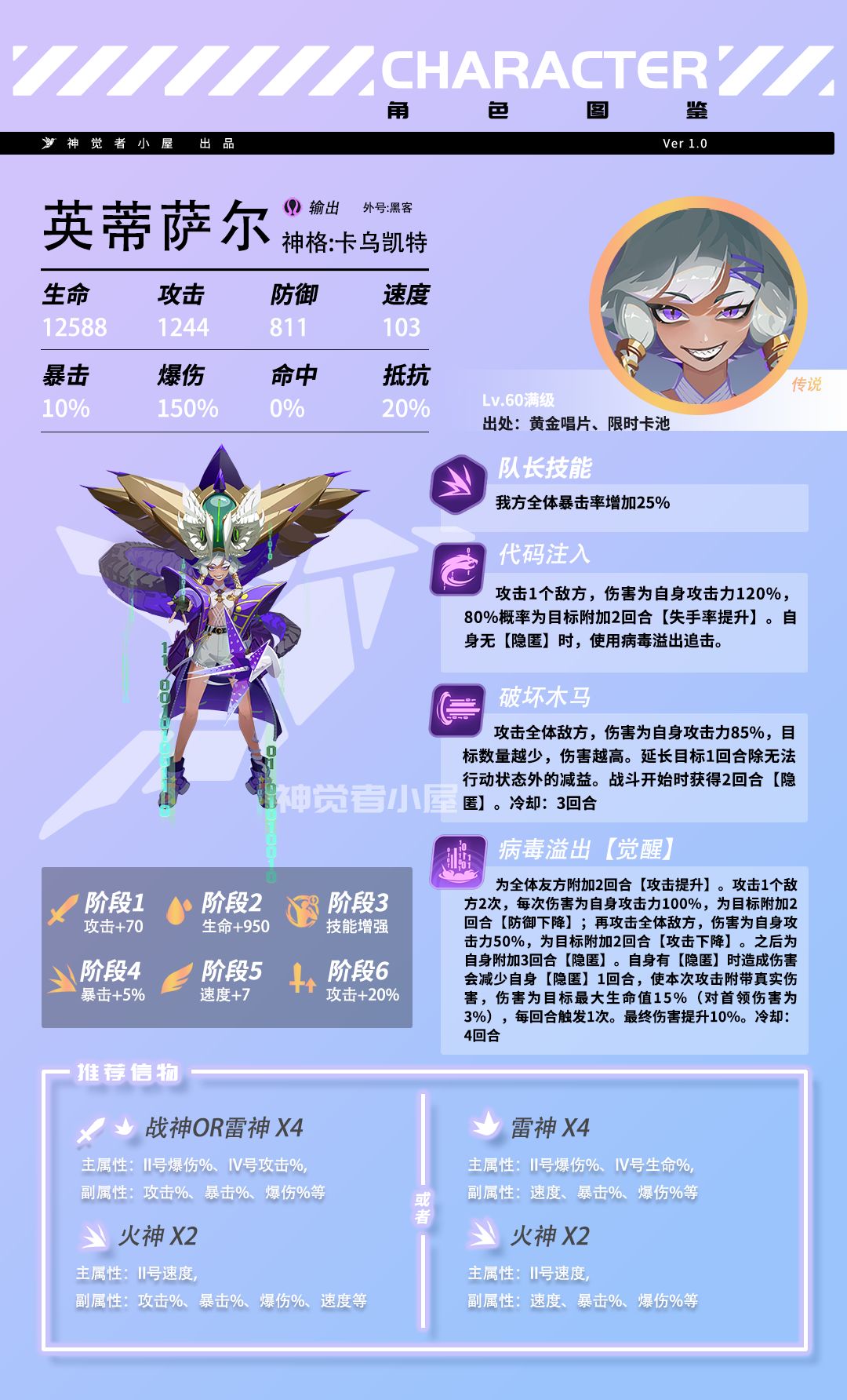 ①技能(代码注入):攻击1个敌方,有概率附加“失手率”2回合。(共鸣2升级为自身无“隐匿”状态时,会使用大招病毒溢出追击);共鸣2前属于一个普通的普攻技能,共鸣2后附加了自身无“隐匿”状态下,使用①技能会追击使用大招的效果,增强了自身的输出手段和生存能力,可以在自身无“隐匿”状态下,使用普攻让自身释放大招并再次进入“隐匿”状态,不过需要注意该追击是建立在释放普攻的前提下,所以当处于控制状态不会触发追击。②技能(破坏木马):攻击敌方全体,目标数量越少,伤害越高。战斗开始获得2回合“隐匿”;群体AOE输出技能,在敌方目标数量少的前提下,伤害可观。战斗开始获得2回合“隐匿”,这个很关键,因为英蒂萨尔真的很脆,“隐匿”可以少吃些伤害,并搭配大招开局使伤害最大化。这里温馨提示PVP该技能,在敌方满员的前提下,尽量少释放,一是伤害很低,二是英蒂萨尔真的真的真的很脆,有时②技能下去,敌人一顿反击,自己就被打残了。大招(病毒溢出):为自身附加2回合“攻击提升”(共鸣6升级为全体英雄附加“攻击加成”),攻击1个敌方两次,并为其附加2回合“防御下降”,之后攻击敌方全体,附加2回合“攻击下降”,最后为自己附加3回合“隐匿”。如果自身有“隐匿”状态,则会消耗1回合“隐匿”,使本次攻击附带真实伤害,伤害为目标最大生命值15%(对BOSS伤害为3%)。输出中少有能为自身附加“攻击提升”的英雄,带破甲,还能为敌方附加减益,功能性拉满。不过这里重点关注消耗“隐匿”状态,带来的真实伤害,该伤害是按目标最大生命值百分比来计算,意味着英蒂萨尔在出肉的情况下,也能保持一定的输出(在下面信物搭配会重点讲下英蒂萨尔PVP信物搭配)