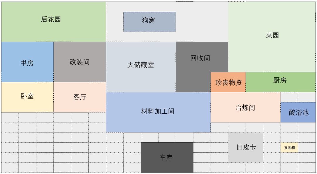 “家应该是怎样的呢”,有人觉得是大仓库,这在前期当然是主要作用,毕竟“生存是第一需求”。到了中期,高效处理工作台和存储物资成为了重点。而到了后期,家也是末日中的避风港,需要有“家的感觉”。布局图: