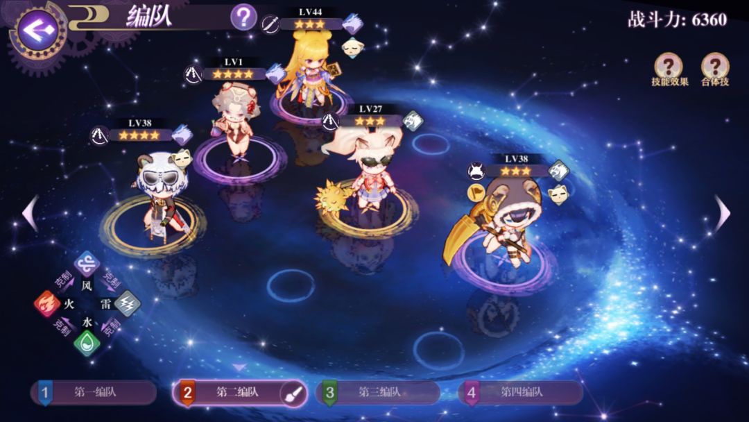 这是前期版,核心熊猫,一回合全部友方行动一轮是45怒气(自身平A并命中可以为自己回复30怒气并为对友包括自己回复3点怒气),熊猫三技能可为青龙对友提供1级20怒气满级40怒气,加上一破10怒三破20怒,这个阵容可以在第二回合稳定开出青龙的三个AOE以及一发合击。阿修罗二技能使其前两回合基本不掉血,河豚三技能和飞鼠(需要抽一只送了两只:首冲和第八天)天赋debuff配合,为全队提供了20%增伤,稳定清屏。