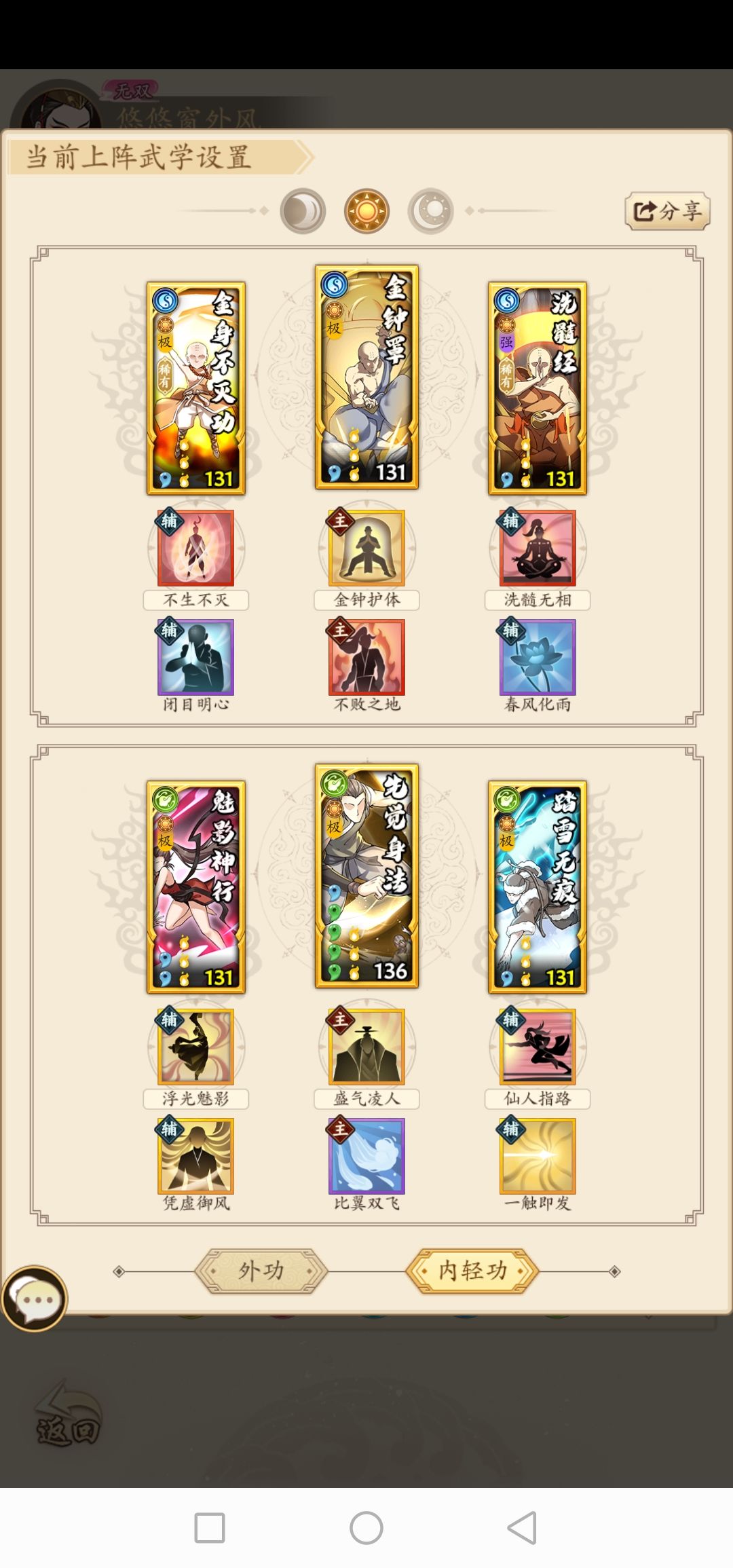 接下来说一下内功和轻功,内功我觉得金钟罩是个很好的保命内功让我更持久主带不败是应为基本上拼招我都是输(谁叫我是零氪呢),不灭和霸王枪有联动谁能拒绝20爆伤呢时不时还能一血翻盘,洗髓的话就是看中它的清状态没什么好说的。轻功的话先决加伤的同时有机会惊心虽然基本只有56号位能触发也相当于多带个惊心招式还是很不错,魅影和踏雪都是为了让自己活的更久不是说活着才有输出吗。