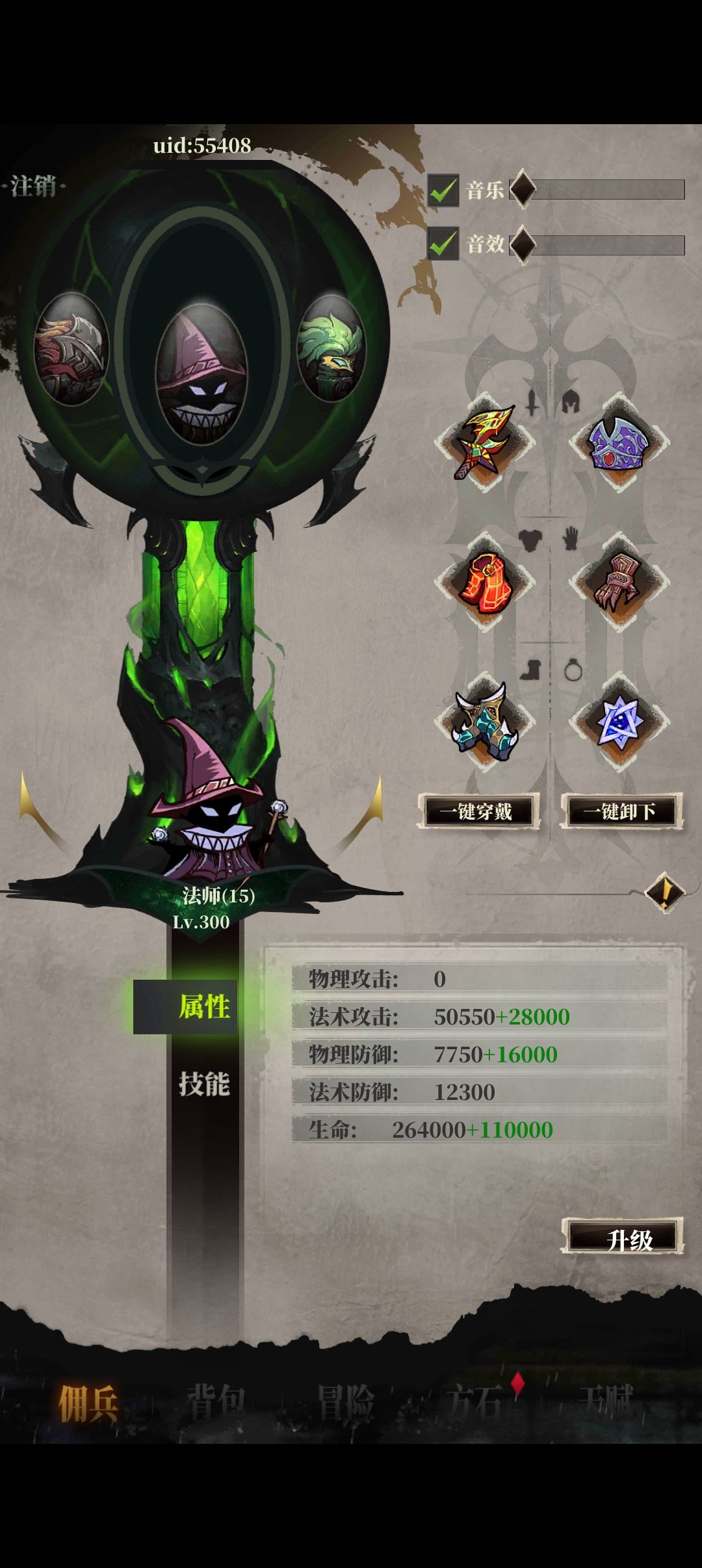 法师就是多点吸血无敌,前期生命回复中期生命回复加吸血(再后面可以换死神头盔衣服怨恨之刃或冰冷的头颅,后期全吸血,最后就是这样子,要多叠层,主动技能按拟态精华酸雨光束的顺序再点自动打boss,很多都能过,稍微升级了一下