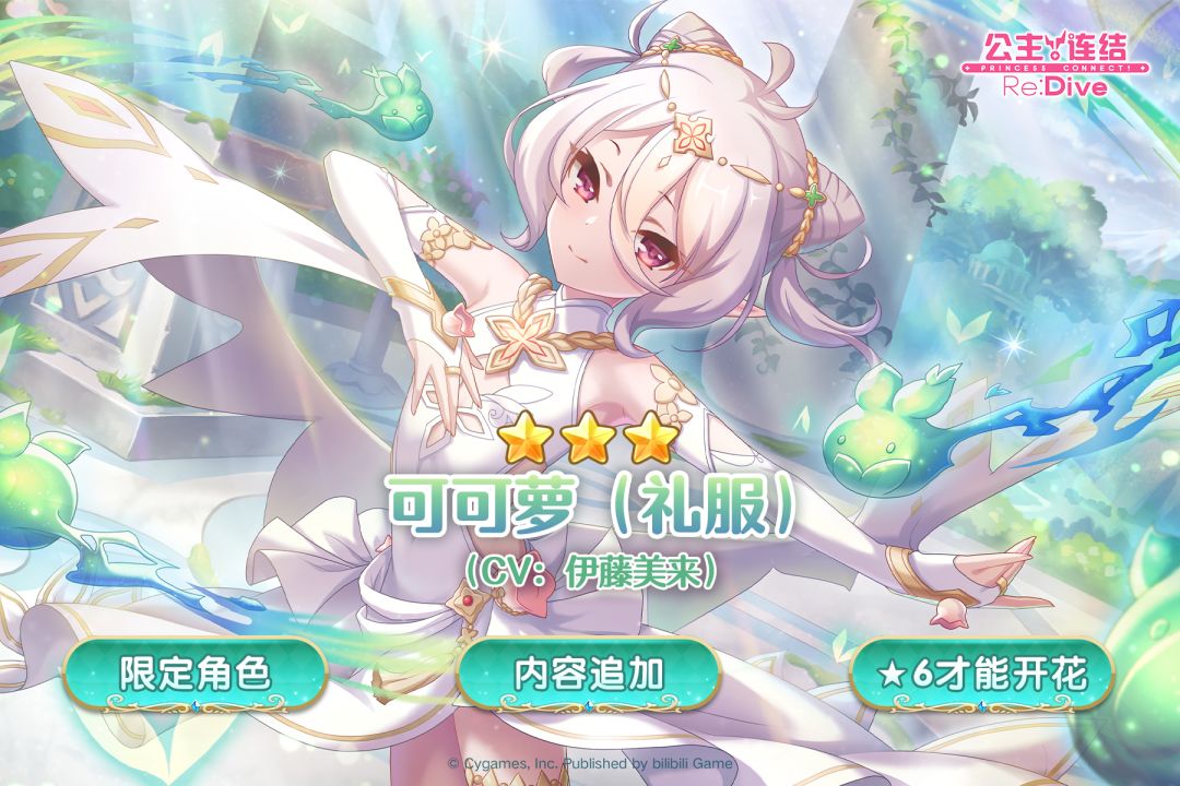 维护结束后,期间限定角色★3「可可萝(礼服)」(CV:伊藤美来)即将登场!游戏内将同时开启「可可萝(礼服)」精选扭蛋;同时,「★6才能开花」将追加新角色,并追加新的游戏内容!