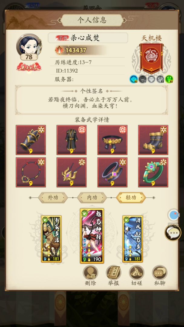 那就可以开始我下面的思路。首先,我想,除非你是全区第一聚气,那总会有人比你聚气快。而在我不去跟人抢聚气,稳定后手的情况下有什么优点呢。我轻功上可以选择强力绝世游龙进行主运,而不用在意星级。我装备上可以随意淬炼攻击提升伤害或者防御增加肉度,而不是固定聚气。我武学搭配上可以稳定太极剑带心惊胆战和指如疾风起手。而不用在意我聚气是否比对手高。在调整招式看战斗轴时每一把可以稳定同样出手顺序,而不用去看每局都随机的轴。