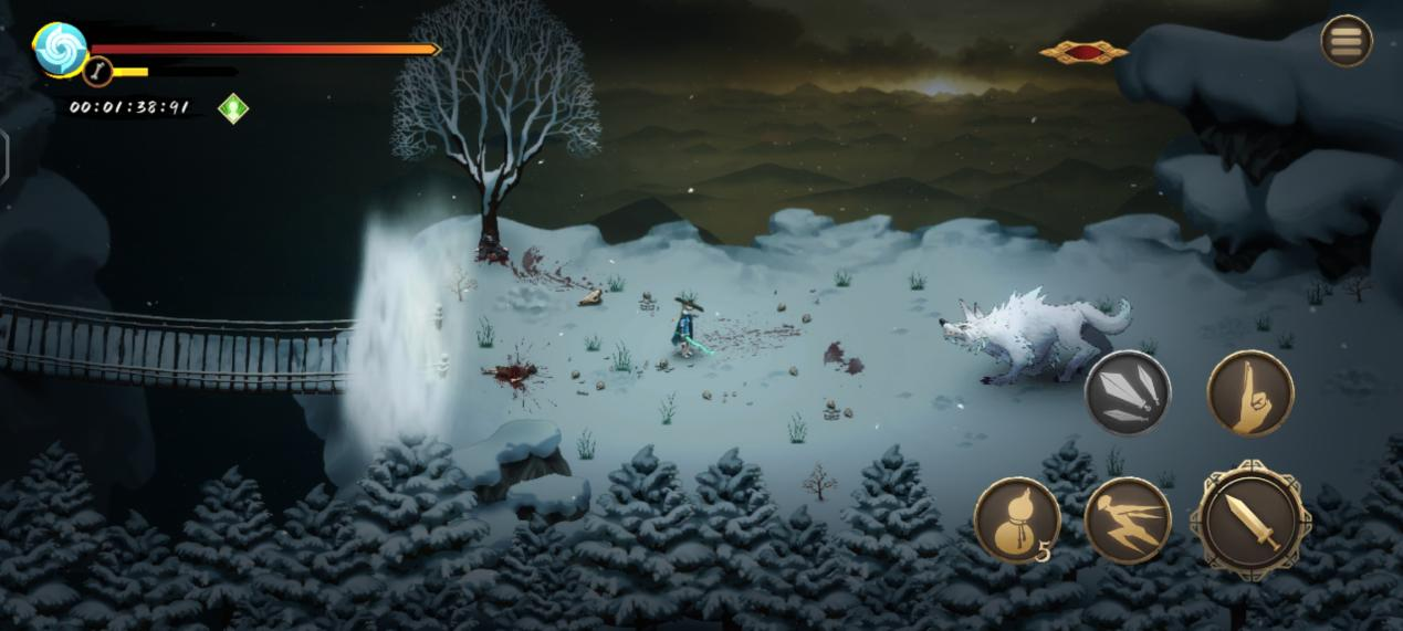 《暖雪》的免费体验内容有两章,“狼之章”与“猪之章”,其中狼之章极短,但同样设计了两条通关路线与两位机制迥异的BOSS,白狼王与玄月。