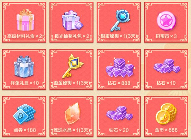 活动期间,累计登录2天可得点券*666、称号[年·福至]贺岁好礼!当日登录游戏后,可以获得3次抽奖机会,抽完3抽后,30分钟后再登录游戏,可以再次赠送3抽。每次抽奖有一定概率获得钻石、鎏金秘钥、极光抽奖礼包、高级材料礼盒等奖励。每天分享页面后,还会获得额外的2次抽奖机会哦!