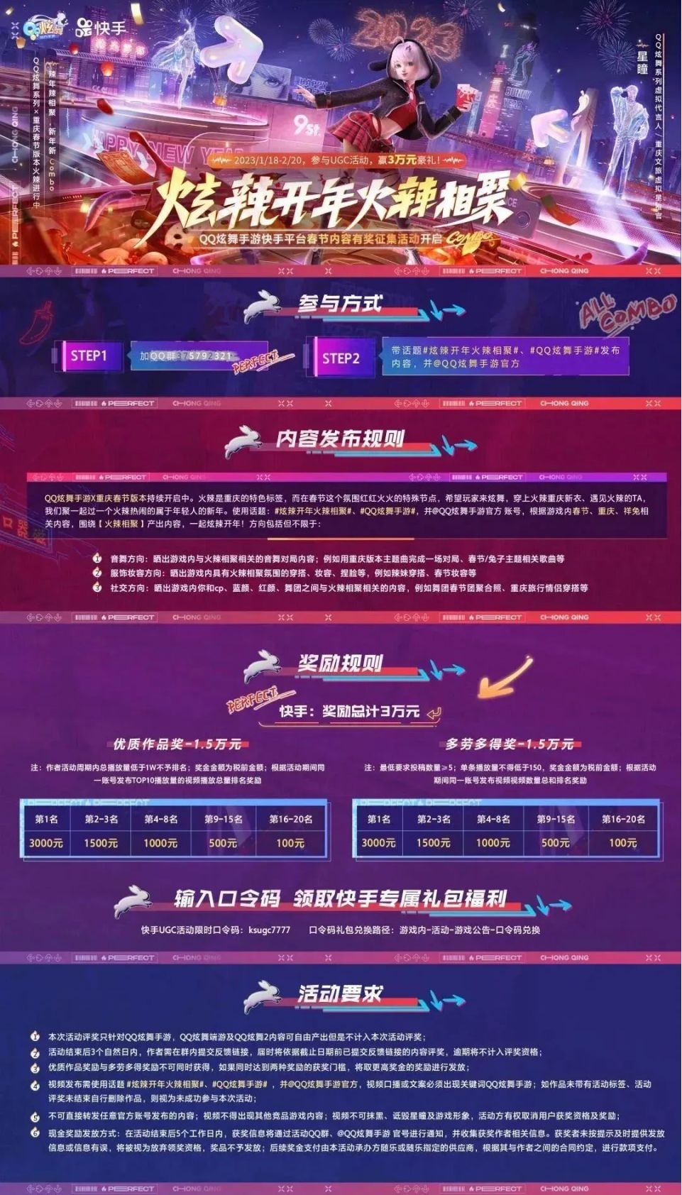 1月18日,《QQ炫舞手游》在微博、抖音、快手、小红书等平台的官方账号已经发起UGC内容征集活动,邀请大家一同参与,带话题#炫辣开年火辣相聚# #QQ炫舞手游#分享自己在游戏内的火辣相聚的相关炫舞内容,数万元奖金等你来瓜分!同时,在大年初一(1月22日)当天,抖音、快手、小红书等平台还有多位炫舞达人分享口令码,送来独家的丰富礼包,可在游戏内兑换专属新年福利!