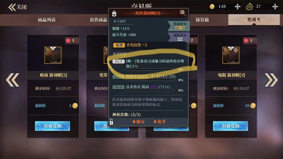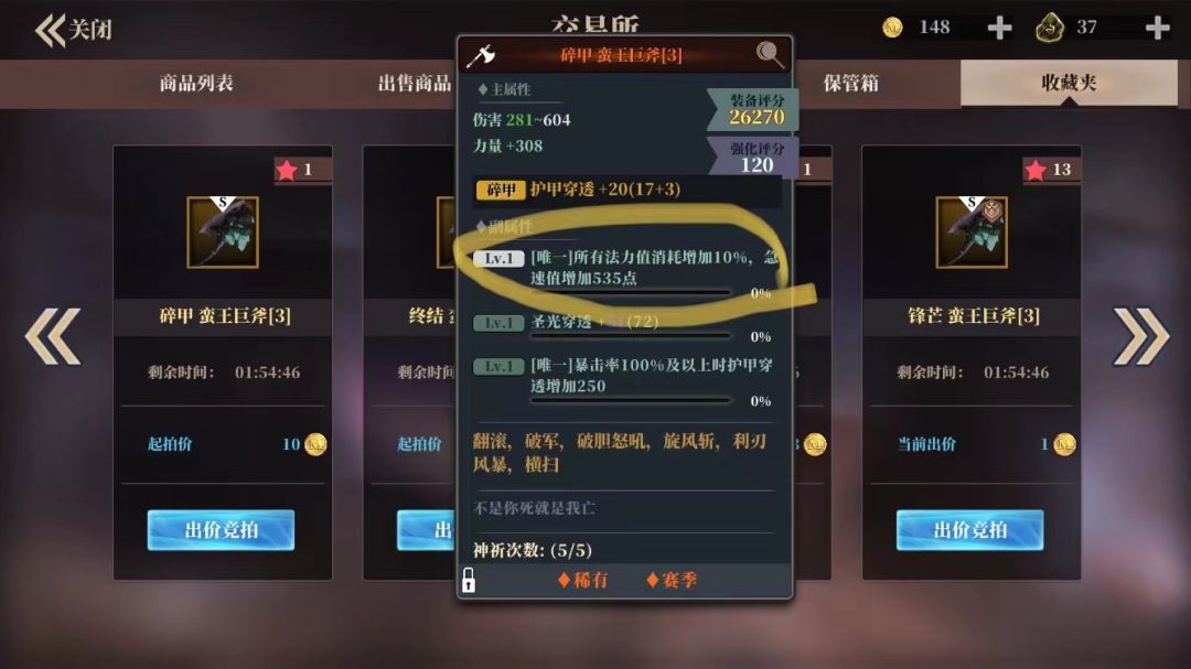 然后这个词条要想快速升上来的话,可以去交易所买相应的词条装备来进行强化,也可以自己下深渊打。要买的话,100%有这个词条的装备是:蛮王巨斧