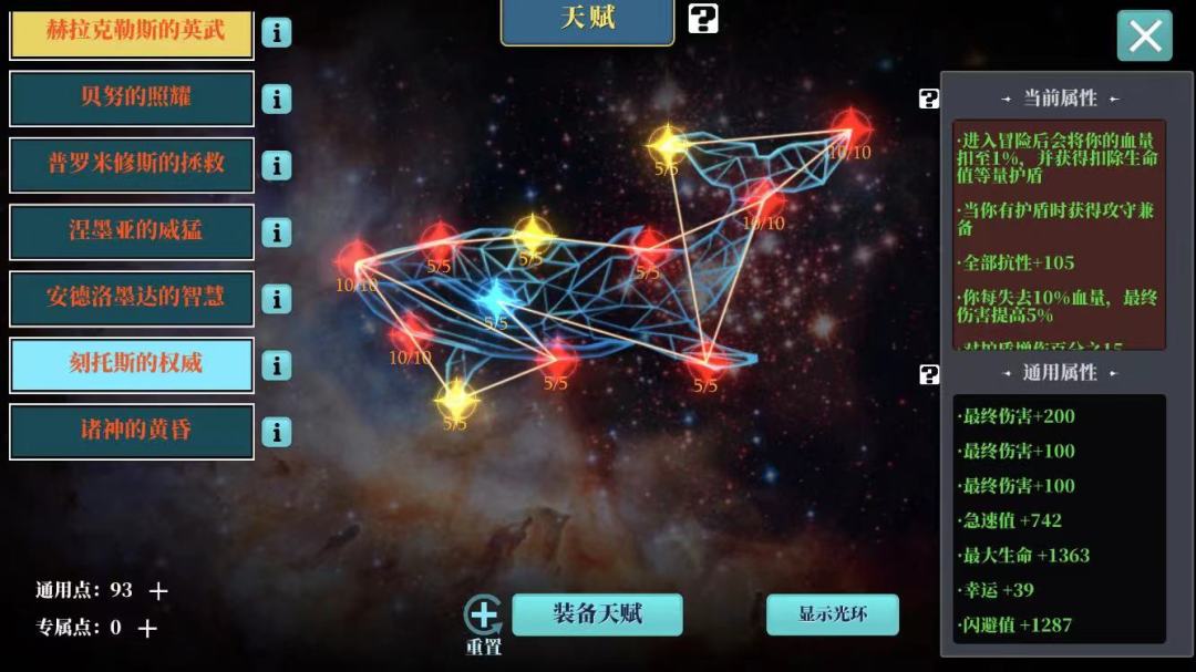 还有很多新人不知道的是,其它不装备的天赋的黄色天赋也是可以增强自身的,比如贝努的照耀天赋的安乐黄点,升到满级就可以加39的幸运值