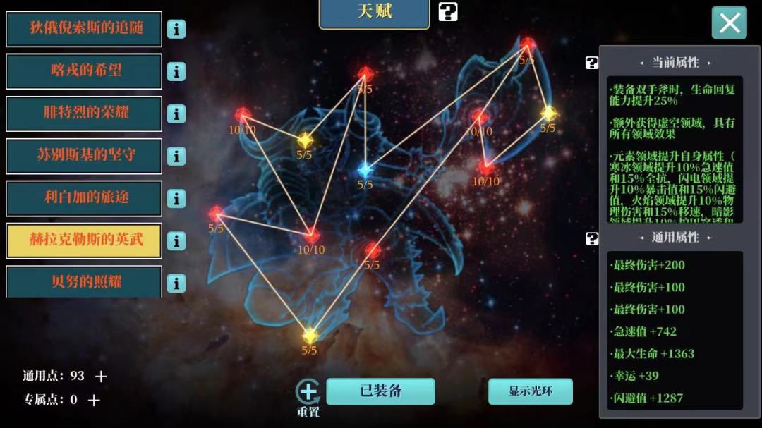 我选择的是赫拉克勒斯的英武,这个配合上垓伊斯的造成伤害有30%机率造成中毒、出血、电击、燃烧、冻结的话特别实用,不用碰到怪也可以一直叠加它们的负面效果。