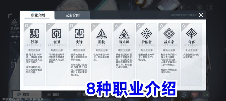 开战之前呢,我们要先搭配出一个8人的队伍。具体根据什么来搭配,一是要看角色职业,职业有8种,分别是铁御、轻卫、尖锋、游徒、筑术师、护佑者、战术家、奇客。这些职业就是我们常说的肉盾、战士、法师、奶妈、辅助等等。
