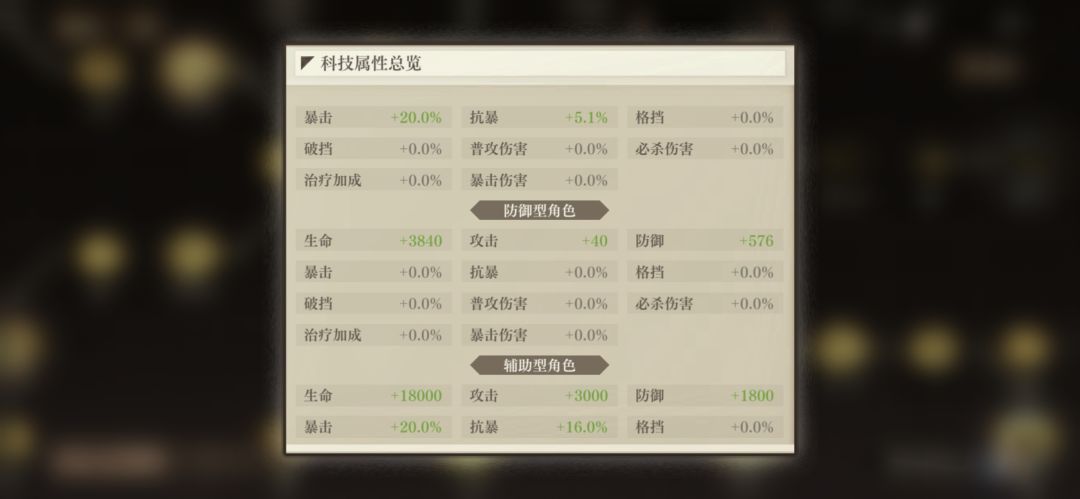 科研辅助的攻,暴,防,血,抗暴,格挡全拉满。(因为我也拉满了攻角色暴击,攻击,所以不够资源升辅助格挡)