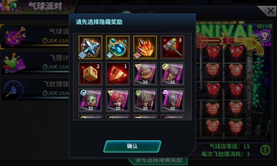 3.每级气球店下面藏有一份隐藏大奖库,各位探长可选择自己想要的1个大奖,扎气球的时候有概率获得该奖励。获得隐藏奖励后气球店将升级。