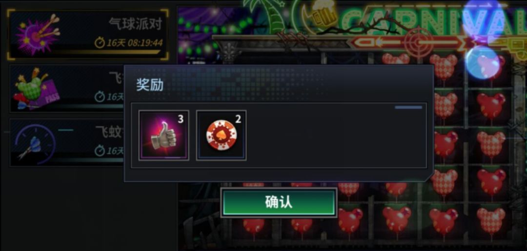 2.活动中,可以使用指定数量的飞蚊镖扎气球,获得奖品(你很强)可作为礼物赠送给好友获得好友币。同时,每次射击有概率获得惊喜奖励,概率随气球店等级提升而提升。惊喜奖励为游戏内资源道具。