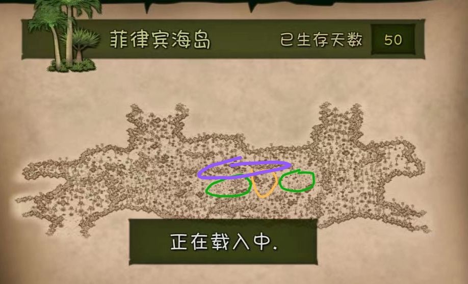 绿色是两片竹林,竹林上方的紫色区域可以建第一个营地,竹林中间的黄色区域(几丛石头中间)可以放大套索陷阱捕野猪和捕鳄鱼陷阱。