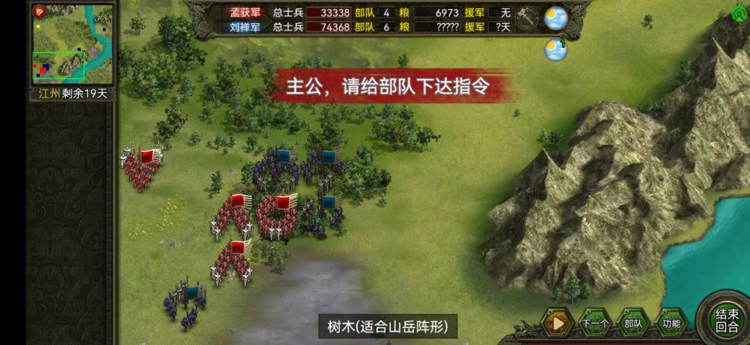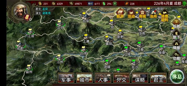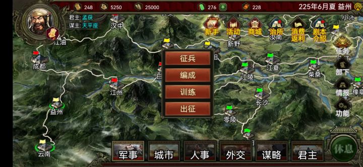 不到一年搞定的孟获 微氪两个武将,一个国色智力90政治80 骑射 回射 雁阵 四个带驰射马。一个智力99 政治80的武将圆阵 奇袭 混乱 回射的自建武将,开局把兵都掉到益州。智力99的圆阵20000兵,祝融和小花带援射把把兵带满 剩下的给带国色的武将。打法智将进林,先晕,然后小花射,然后祝融射,最后带国色的打,射手不进树林。先打成都,带回射的打城时让他在电脑守城攻击范围内。拿下成都后存档,刷粮食和曹丕结盟能援助你2000金剩个400金补体力,推江油还是江州个人喜好推。打法就是智将在树林晕电脑里,三个射手不进树林移动的打。