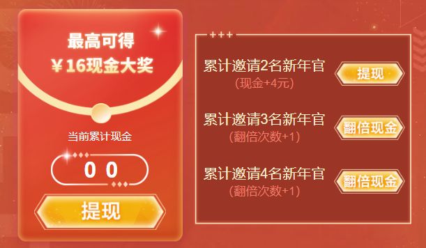 活动期间,玩家通过邀请新年官(新年官身份条件为:2023年1月22日0点后注册的新玩家或2023.1.15-2023.1.21未登录游戏的玩家)助力,达成对应助力人数(具体以界面任务为准)即可翻倍现金,最高可得16元现金红包!每档现金为先到先得,未抢到的玩家提现后统一获得对应档位的钻石奖励。