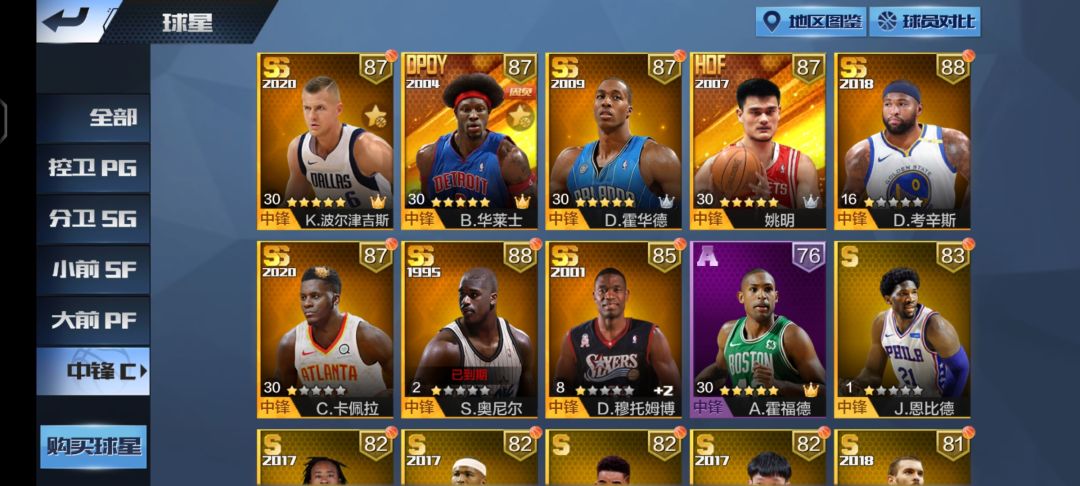 空间型:波尔津吉斯(唐斯,恩比德)。适用于队友玩扣将,拉开让队友扣或接球投三分,甚至还有不俗的自主进攻能力。是所有钻石球星里最好的空间型中锋。缺点篮板,防守,盖帽都不太靠谱。