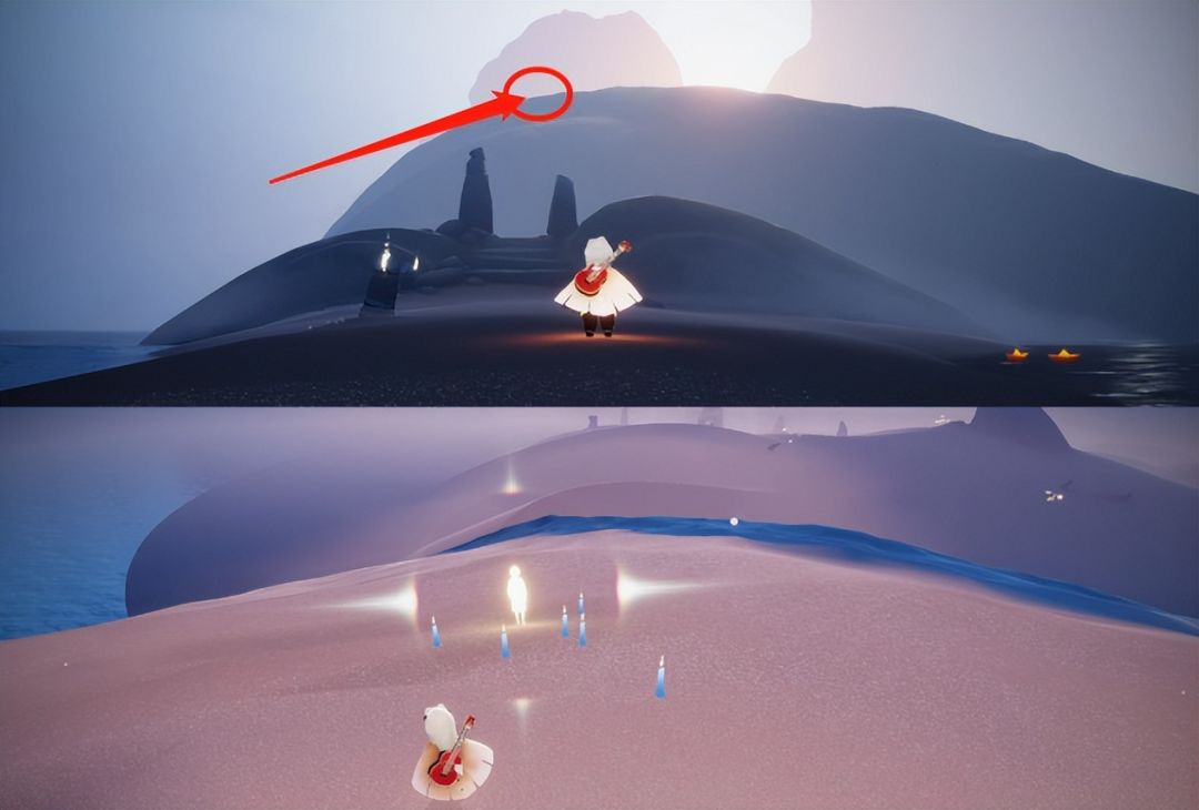 第三个光之翼:我们拿到第二个光之翼之后往右前方飞,来到废弃的小舟上再看向右前方,能看到一个凸起的小坡,我们往那边飞过去,然后就能看到一个洞口,需要解锁一个晨岛的先祖才能进去,在里面就是第三个光之翼了。