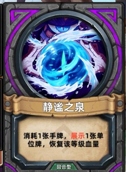 首先,泉水是一张稳定的回血牌,平均回复5/3(后面有计算)血量,消耗一张牌。如果不是紧急情况,尽量用等级较低的牌,以及没有入场技或入场技在当前无大用的牌去触发。如果恰好是强力牌,也不必触发。此外,由于其展示的是单位牌,可以消耗单位牌数量,配合后面的强令奉献轻松拿到魔法牌。以咆哮战场举例,拿到强攻可以防止对面伤害,拿到治疗也可以恢复,所以如果算上魔法牌,其回复量也高于这个数。