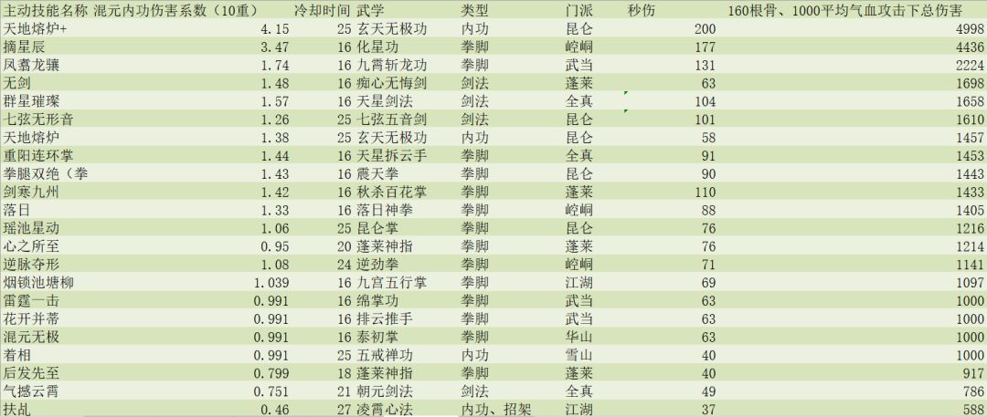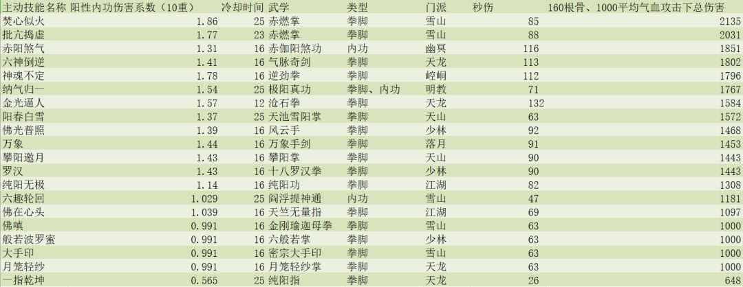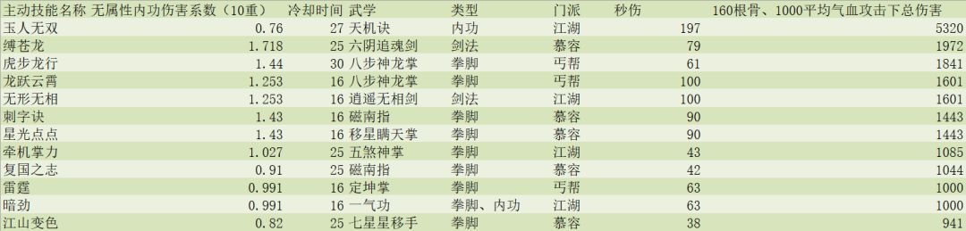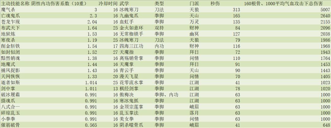 主动技能无属性、阴性、阳性、混元、毒性内功伤害排行