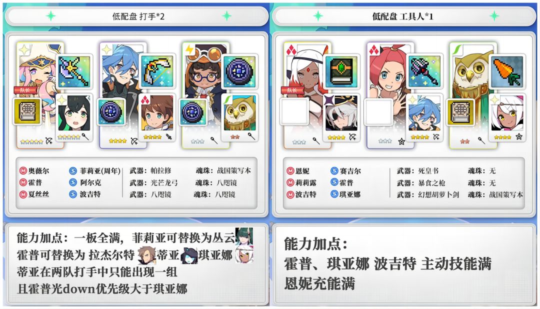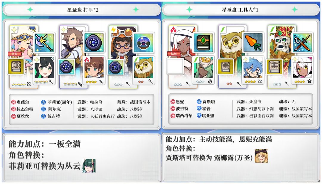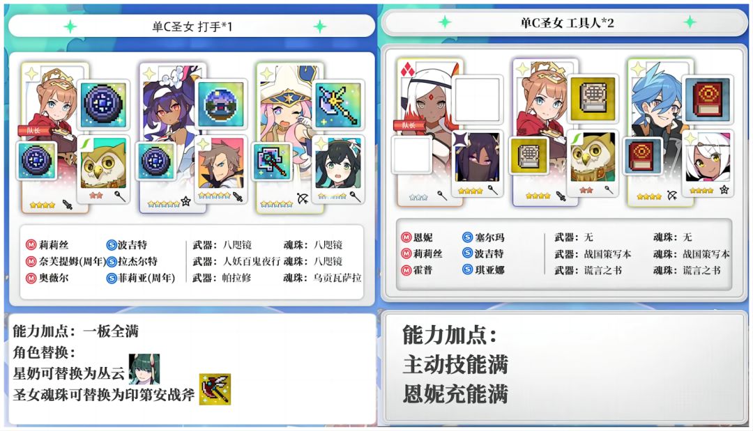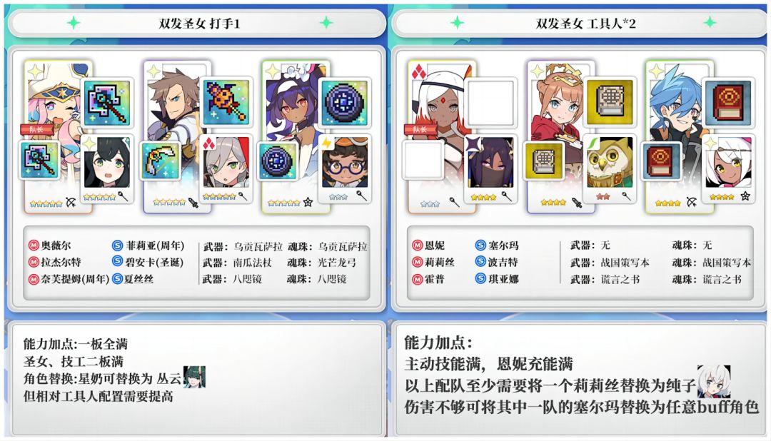 本次活动踢罐有两个主要思路,分别是圣女单c和低配星圣/光弹的双c思路,需要注意的是由于光属性主c队伍没有驱散的位置,所以工具人至少需要提供三个驱散来驱散掉暗龙开局的三个buff