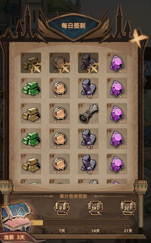 连续登陆七天,还可以大量金币+强力道具礼包,持续登录21天还有更多好礼等你获取