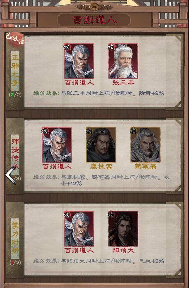 理由:绝技(对敌方前排造成伤巨额伤害,对有异常状态的目标必定暴击)。心法(进入战斗后首次受到的伤害减少50%);还记得我们的杨逍、阳顶天与百损道人不要太契合了,如果还觉得概率不够,还有宠物猴子25%封穴以及何足道的50%概率晕眩不容错过!