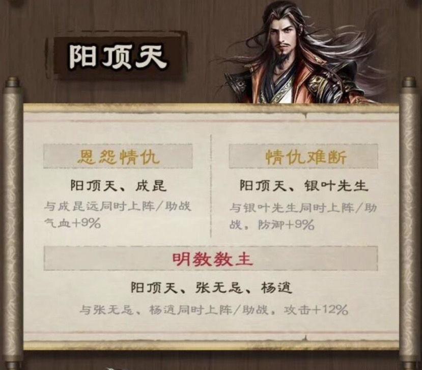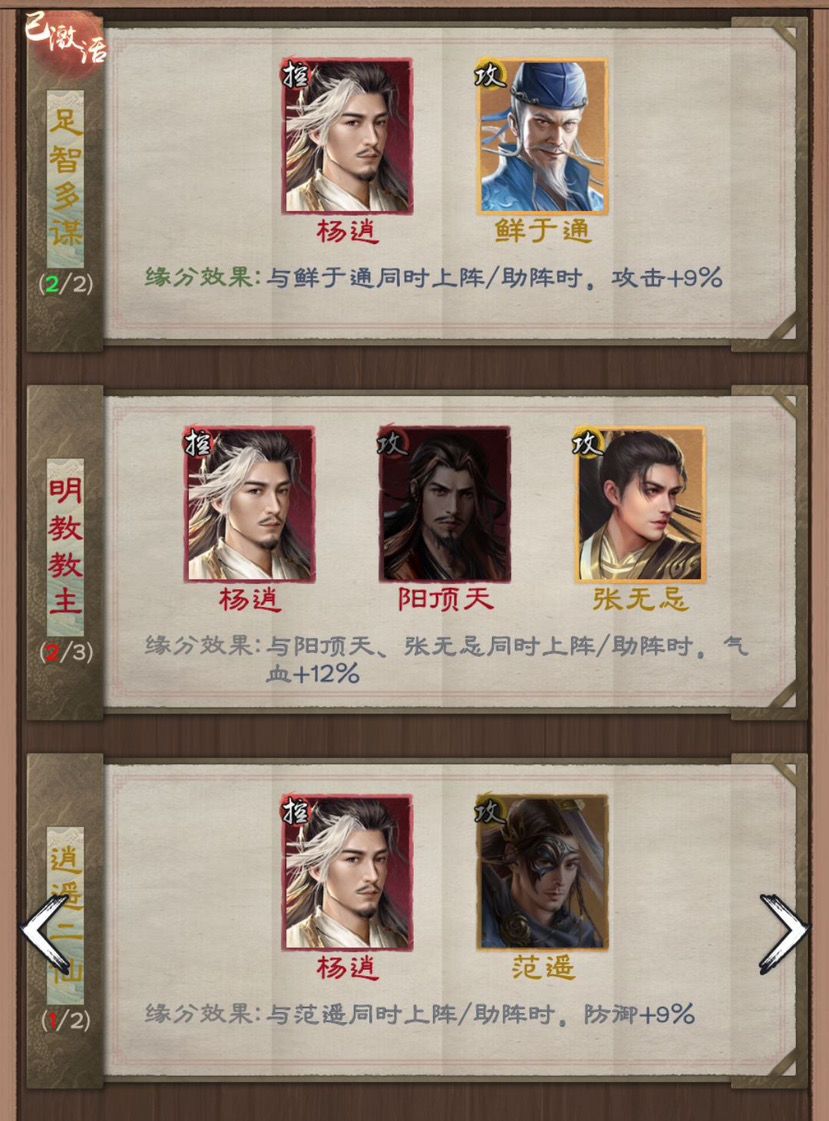 理由:用过的都说好,很多侠客的克星。也是我们开启越级战力的开端,配合之前的缘分中期使用足够了。(范遥缘分看个人能力有当然是最好,微氪玩家可以不着急开启)鲜于通传功给杨逍全力培养。