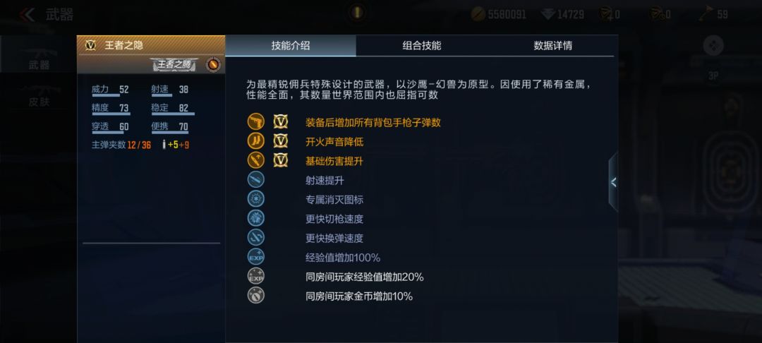 王者之隐以沙鹰-幻兽为原型,因使用了稀有金属,性能全面。这款副武器是王者之腾套装的副武器,在激活套装后,还可享受套装加成:射击精度提升、射速小幅提升,专属套装手套。