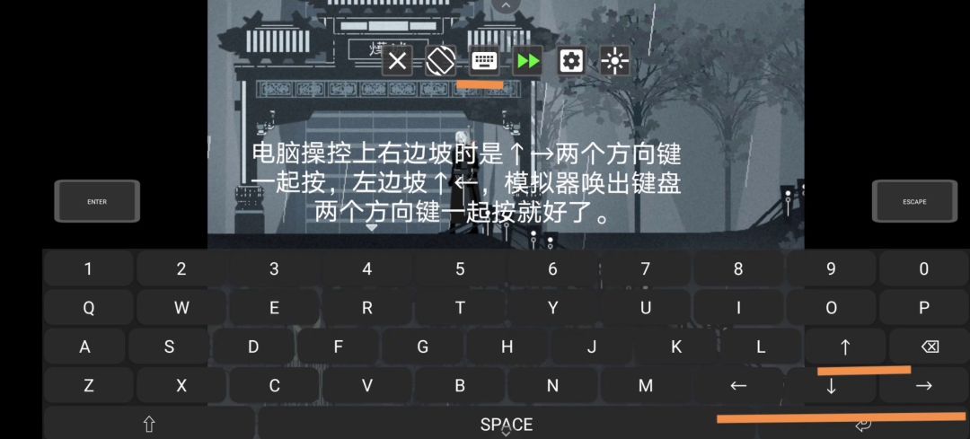《烨城》上坡问题:电脑操控上右边坡时是↑→两个方向键一起按,左边坡↑←,模拟器唤出键盘两个方向键一起按就好了。