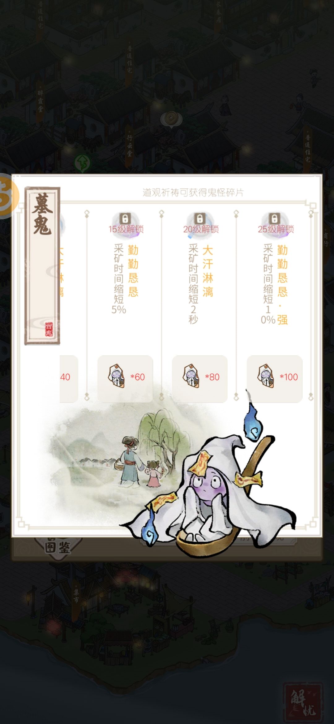 这边主要建议先拉到10,解锁1,再去看看其他鬼,其他鬼够了,在慢慢拉,新手千万不要直接等25,没有资源只会拖慢其他进度,碎片又不会跑,就少赚一点银子,长期玩下去都会有的。